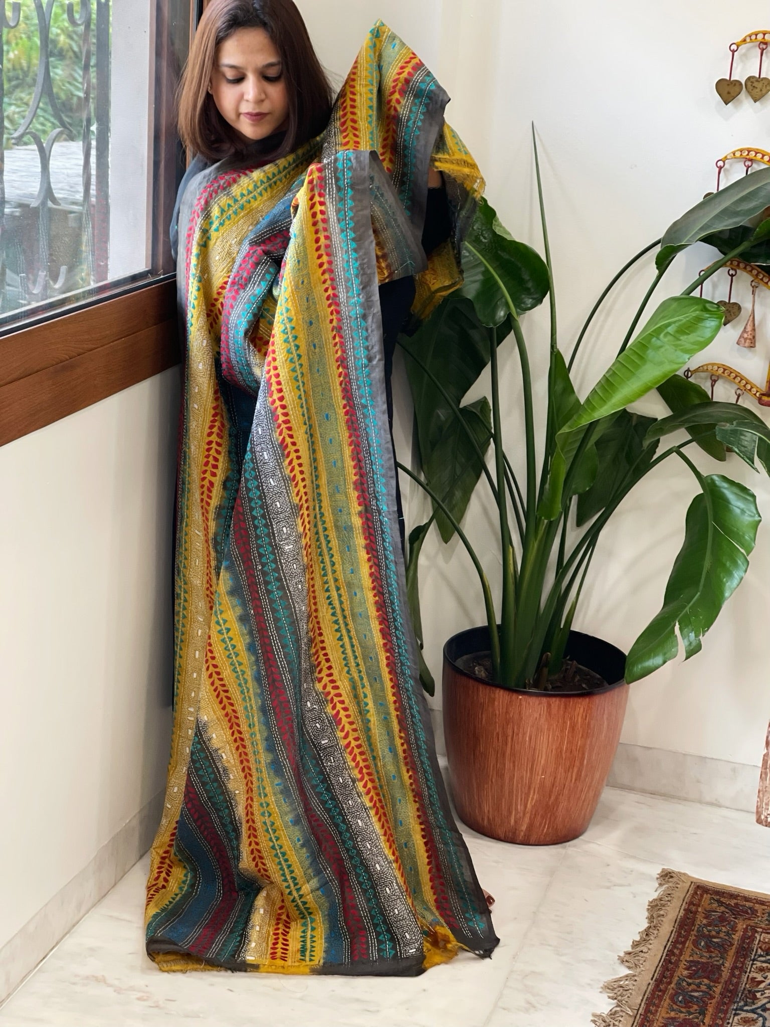 Yellow, Charcoal Grey Handmade Kantha Dupatta in Silk