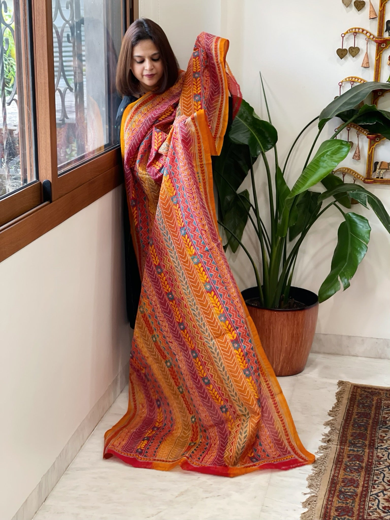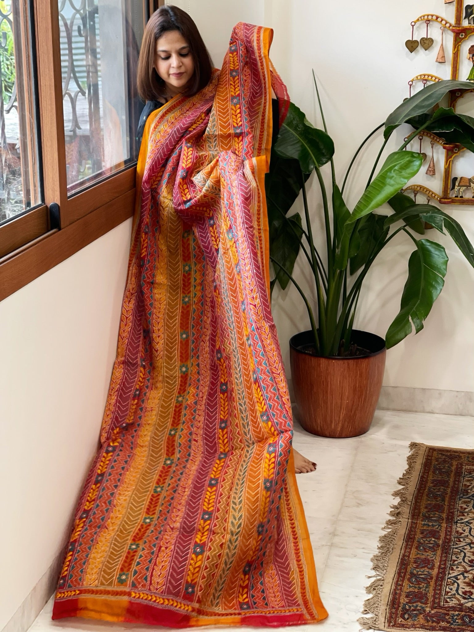 Expertly crafted and truly one-of-a-kind, our Handmade Kantha Dupatta in Silk is a masterpiece. Made from Bangalore silk and beautifully dyed and embroidered by Bengali artisans, each piece is a unique work of art. Elevate your wardrobe with this exquisite accessory.