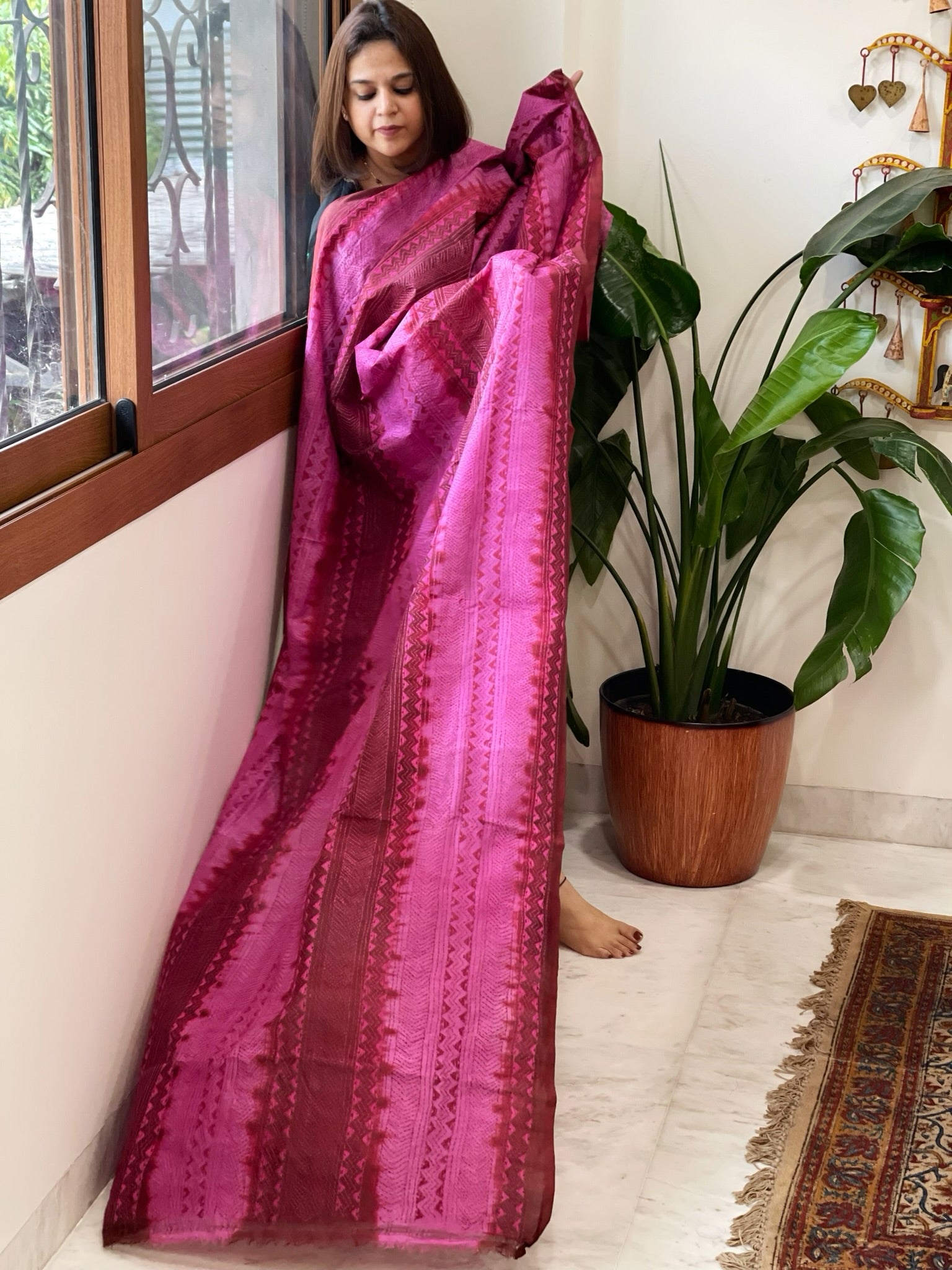 Pink, Maroon Handmade Kantha Dupatta in Silk