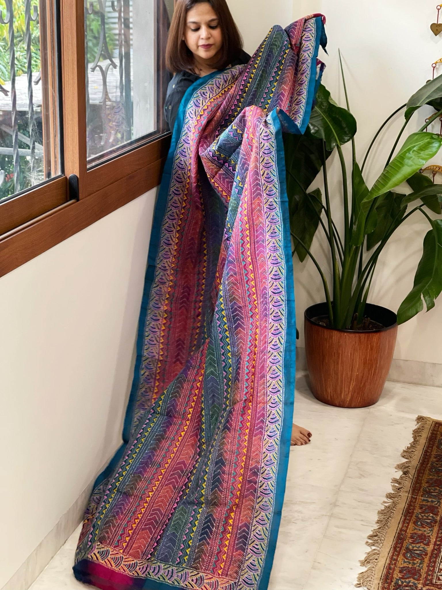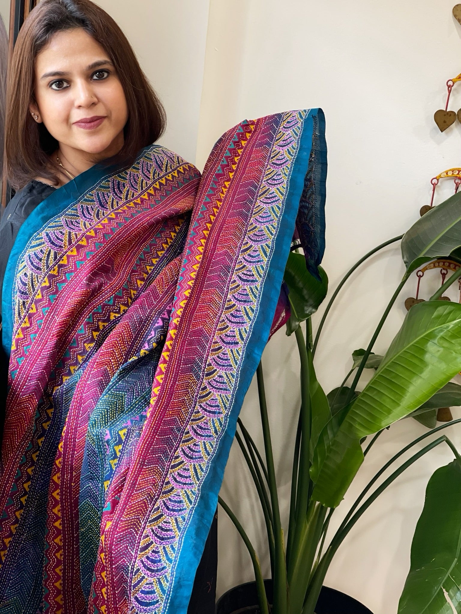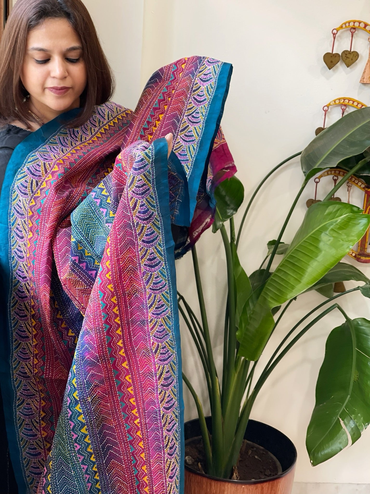Blue, Pink Handmade Kantha Dupatta in Silk