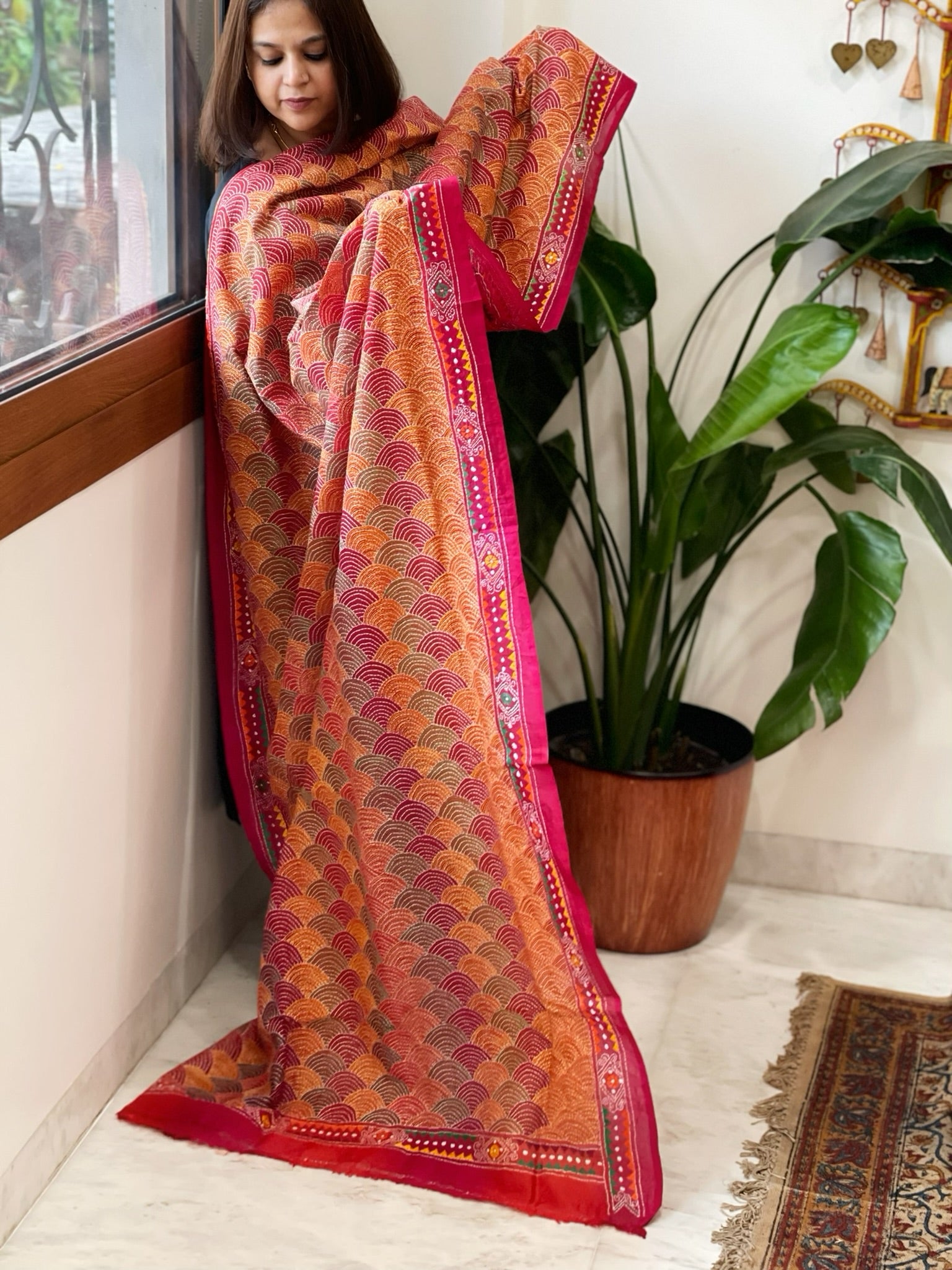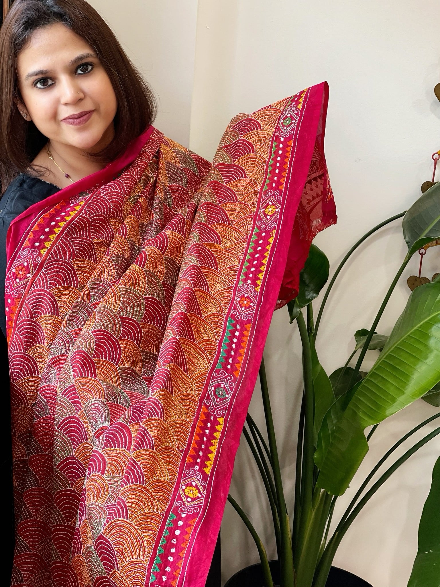 Expertly crafted and truly one-of-a-kind, our Handmade Kantha Dupatta in Silk is a masterpiece. Made from Bangalore silk and beautifully dyed and embroidered by Bengali artisans, each piece is a unique work of art. Elevate your wardrobe with this exquisite accessory.