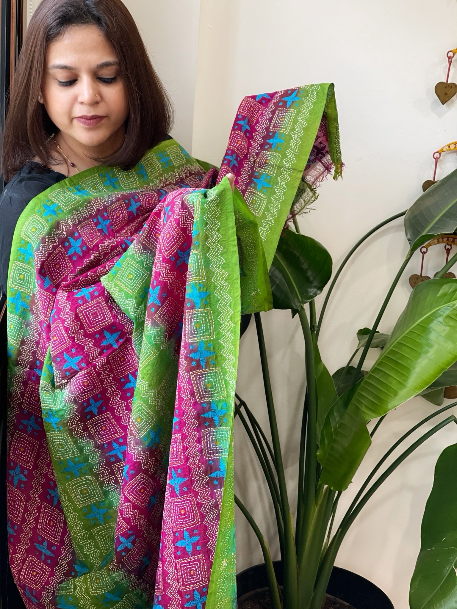 Green, Pink Handmade Kantha Dupatta in Silk