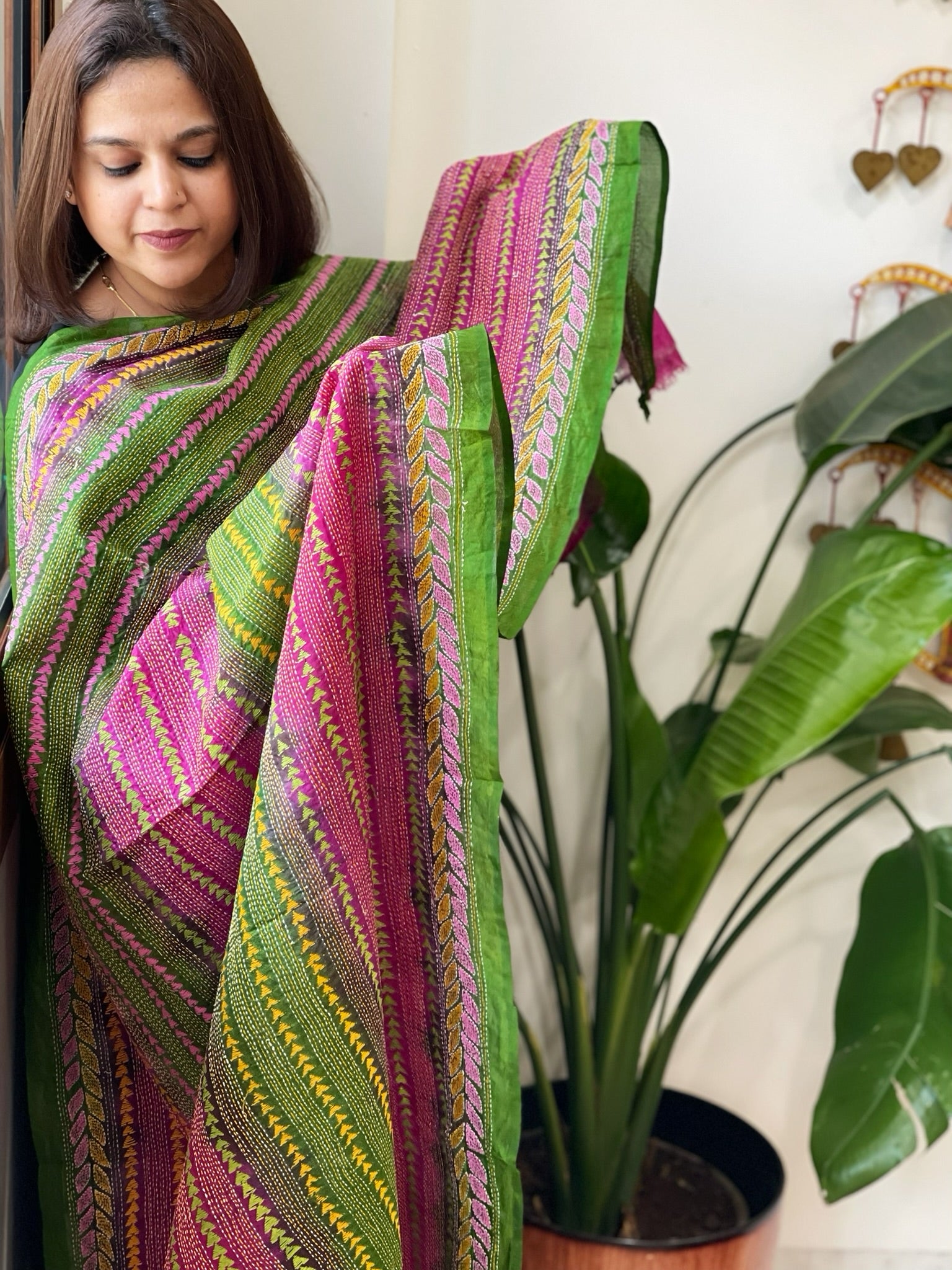 Expertly crafted and truly one-of-a-kind, our Handmade Kantha Dupatta in Silk is a masterpiece. Made from Bangalore silk and beautifully dyed and embroidered by Bengali artisans, each piece is a unique work of art. Elevate your wardrobe with this exquisite accessory.