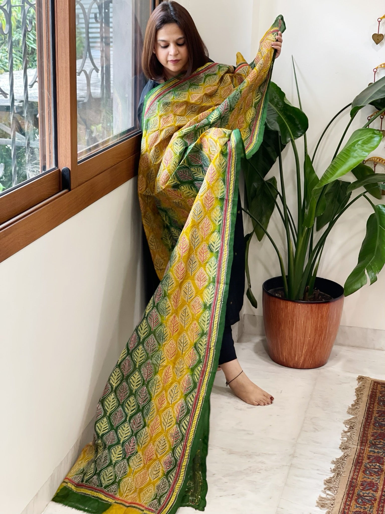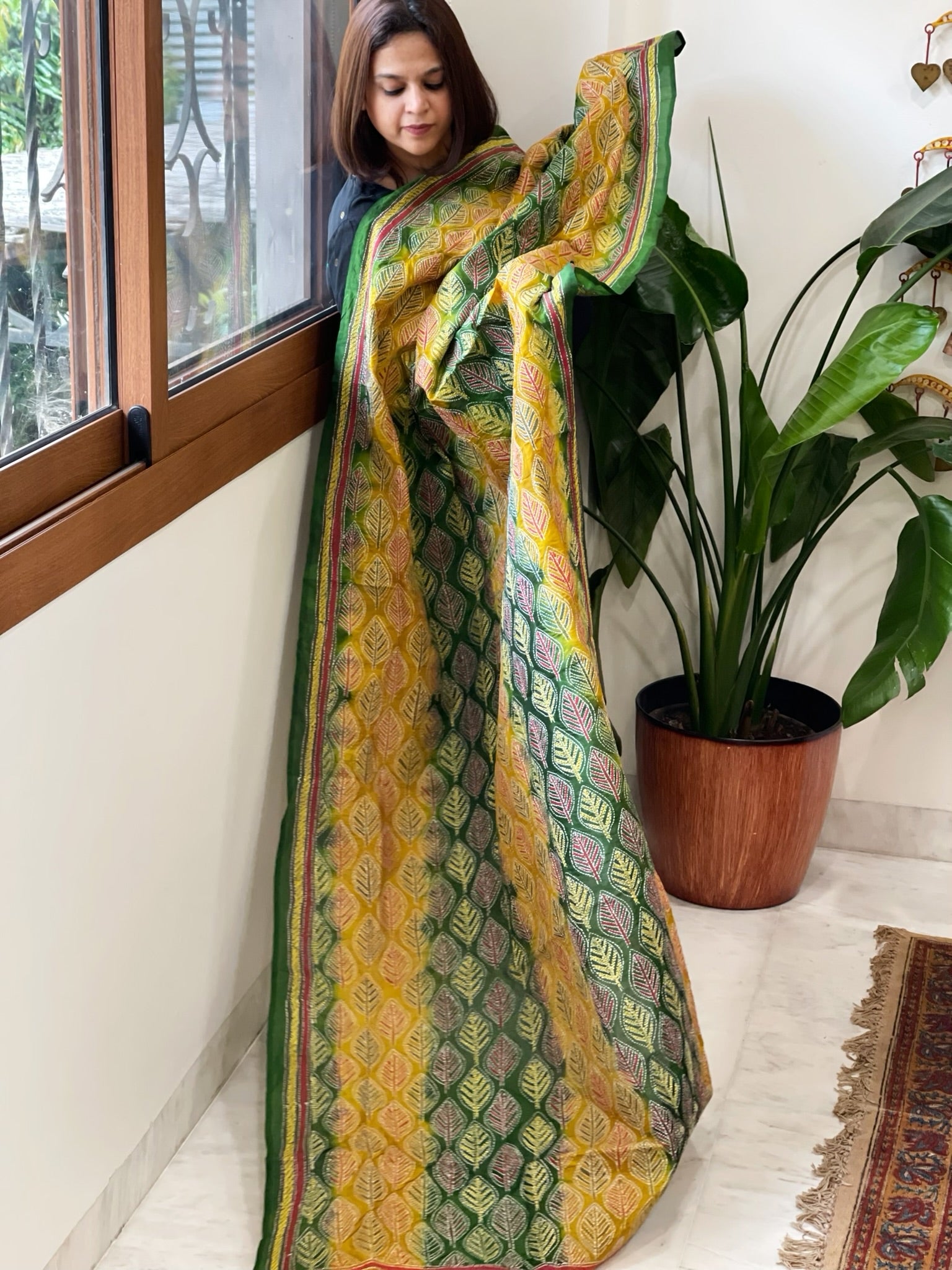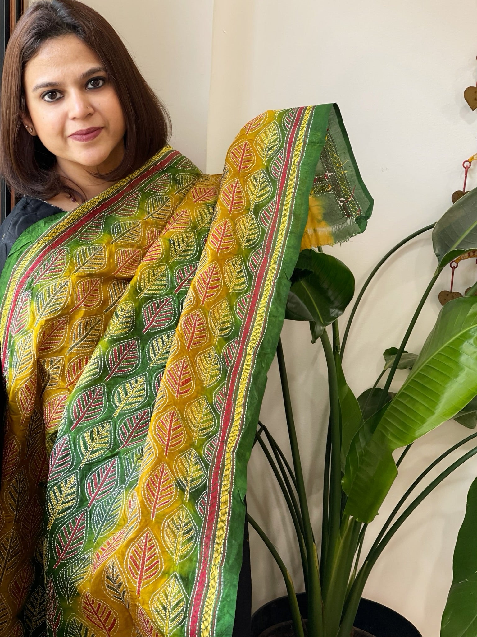 Green, Yellow Handmade Kantha Dupatta in Silk