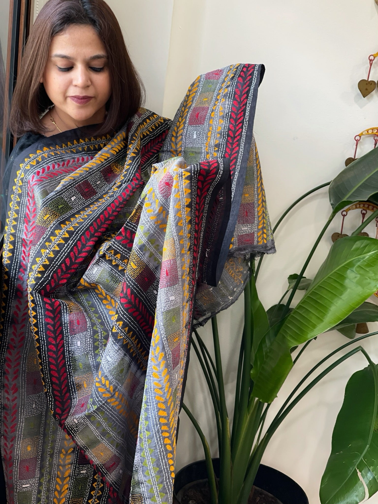 Grey, Black Handmade Kantha Dupatta in Silk