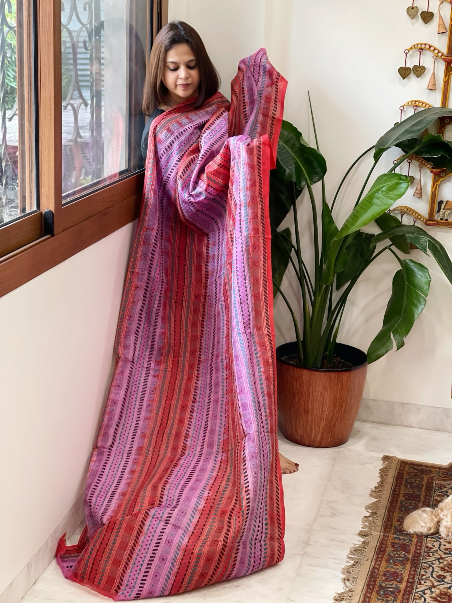Expertly crafted and truly one-of-a-kind, our Handmade Kantha Dupatta in Silk is a masterpiece. Made from Bangalore silk and beautifully dyed and embroidered by Bengali artisans, each piece is a unique work of art. Elevate your wardrobe with this exquisite accessory.