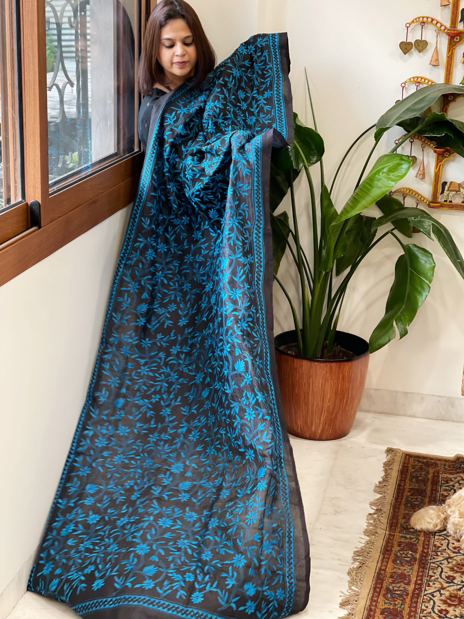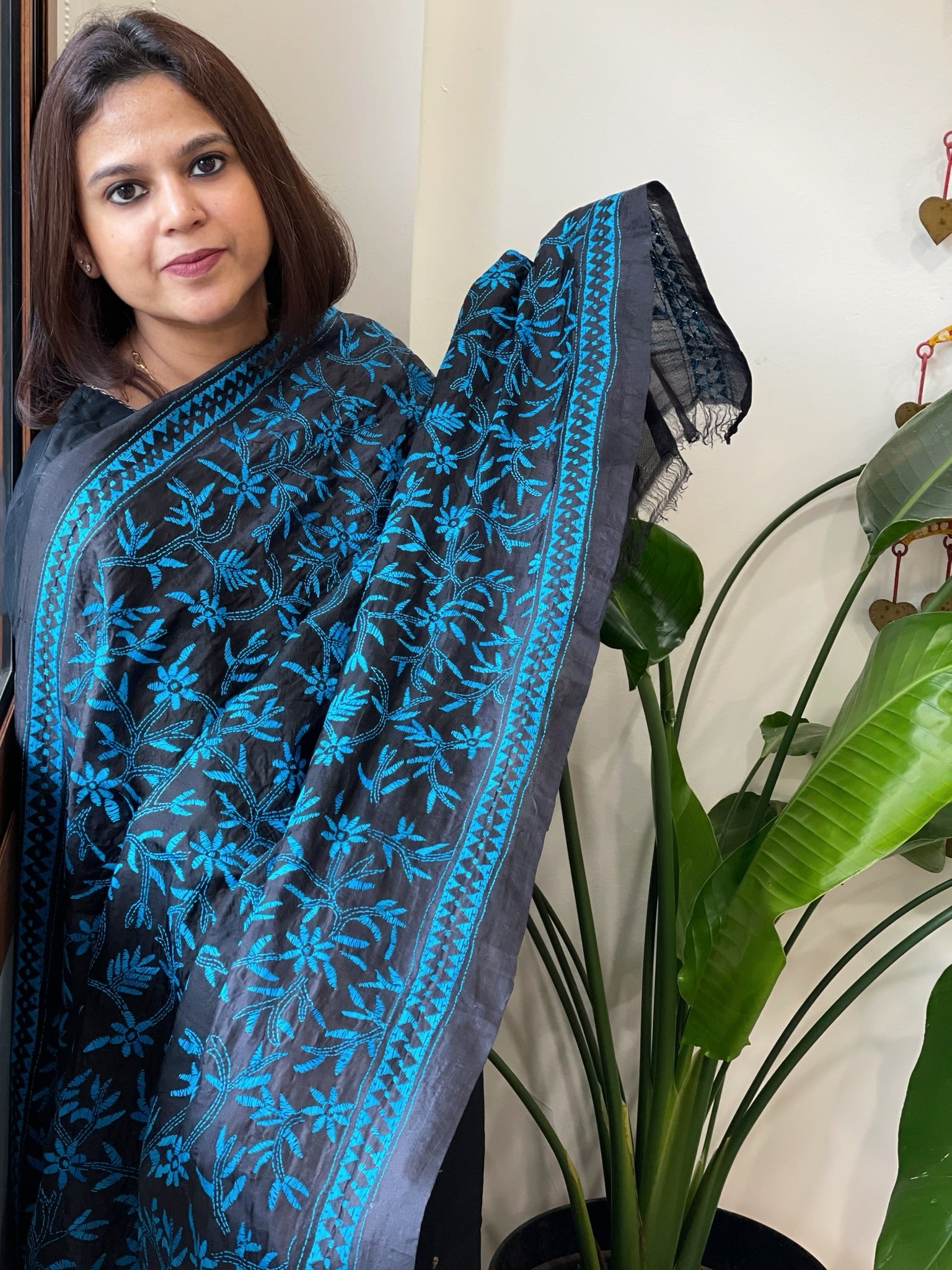 Expertly crafted and truly one-of-a-kind, our Handmade Kantha Dupatta in Silk is a masterpiece. Made from Bangalore silk and beautifully dyed and embroidered by Bengali artisans, each piece is a unique work of art. Elevate your wardrobe with this exquisite accessory.