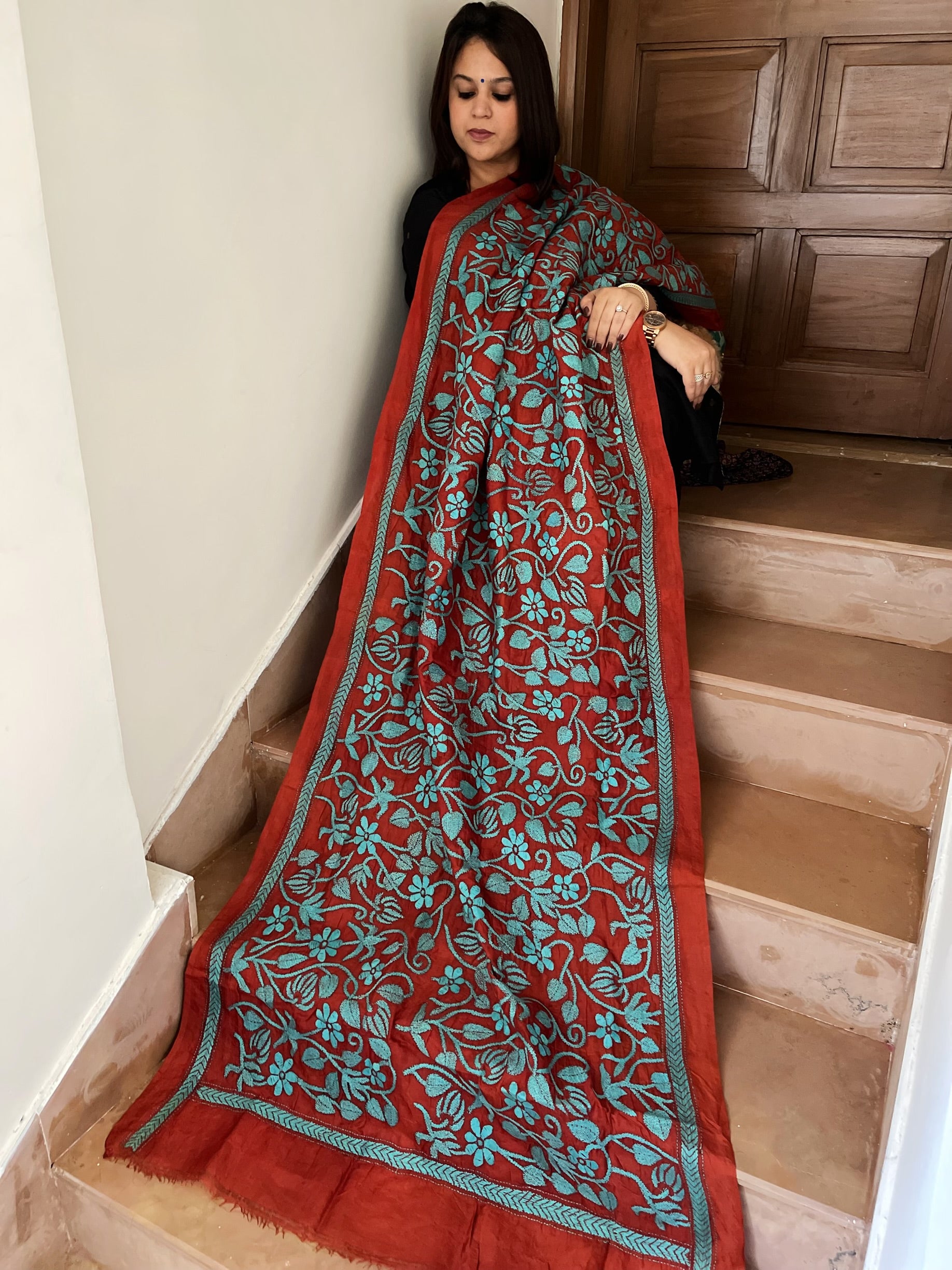 Expertly crafted and truly one-of-a-kind, our Handmade Kantha Dupatta in Silk is a masterpiece. Made from Bangalore silk and beautifully dyed and embroidered by Bengali artisans, each piece is a unique work of art. Elevate your wardrobe with this exquisite accessory.