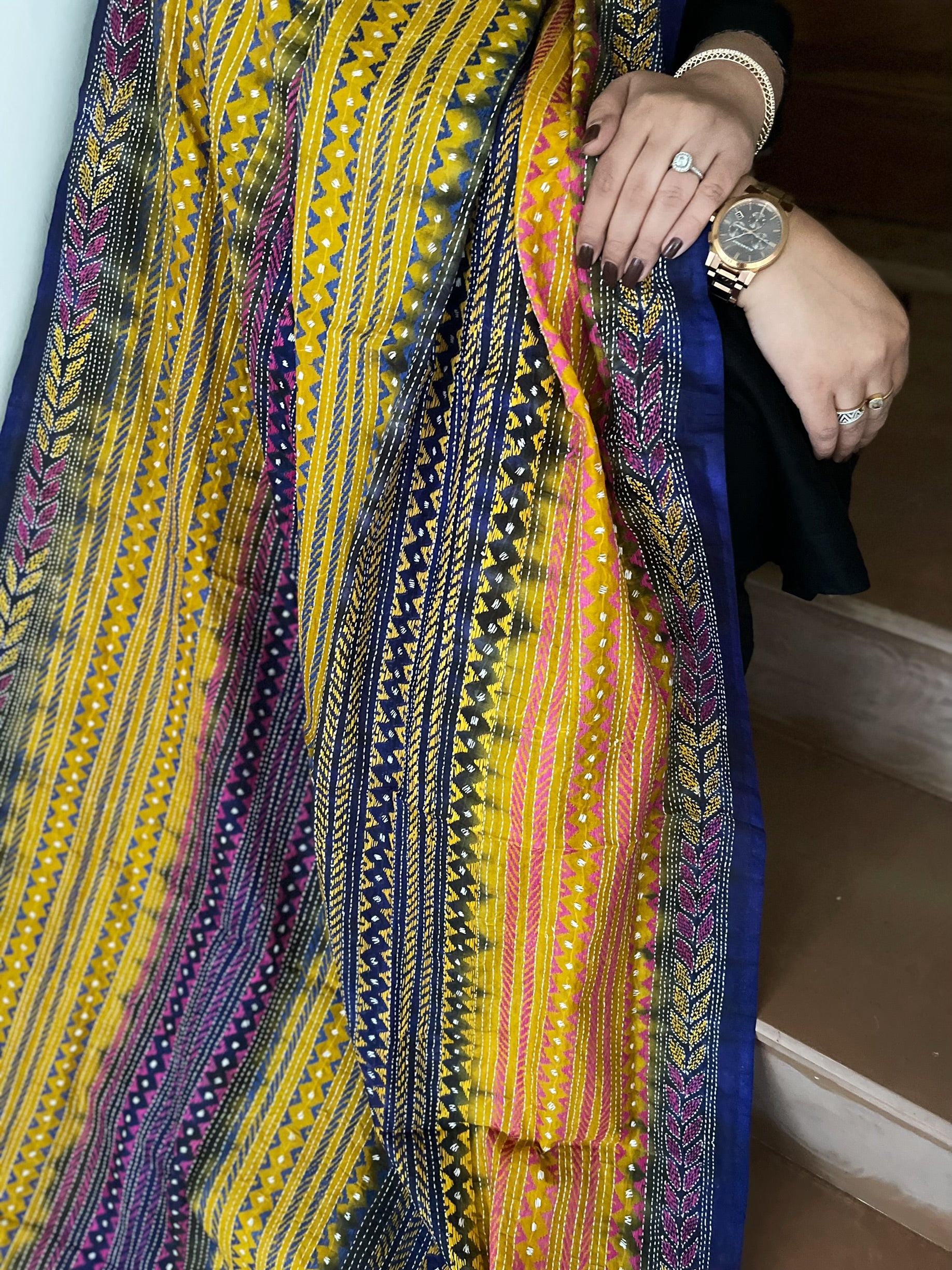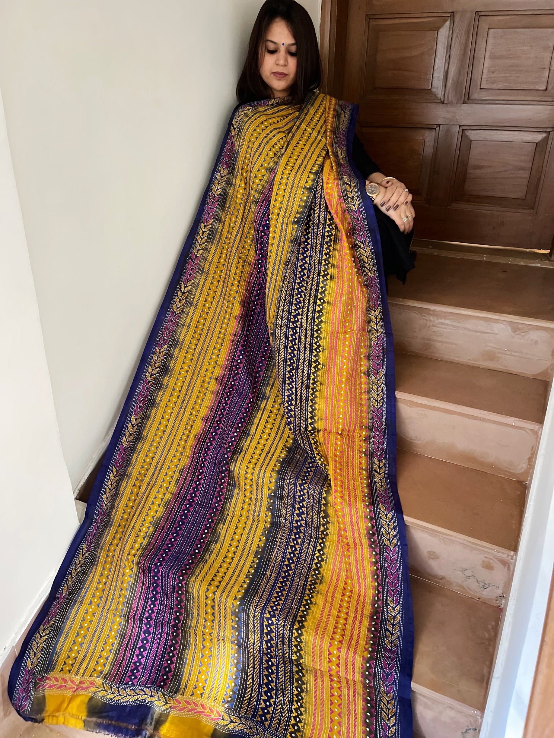 Yellow, Blue Handmade Kantha Dupatta in Silk