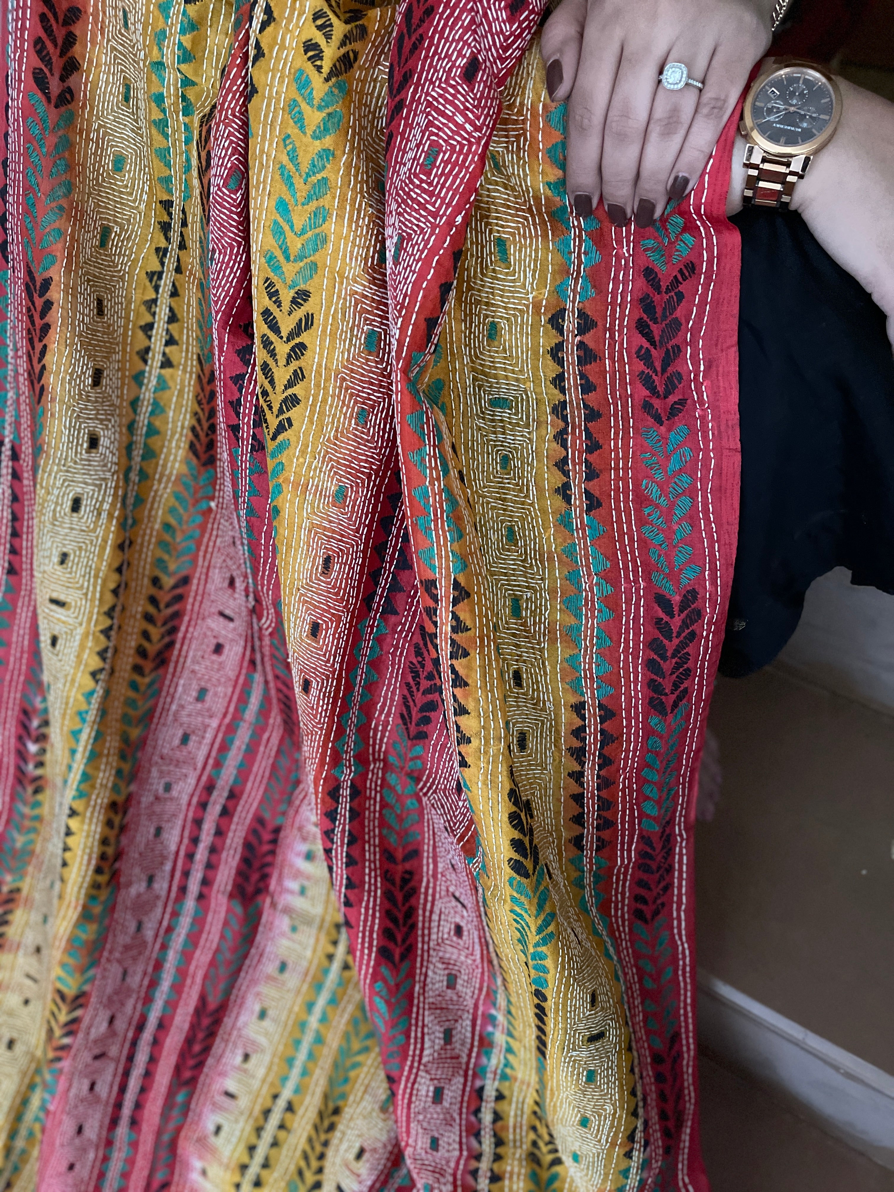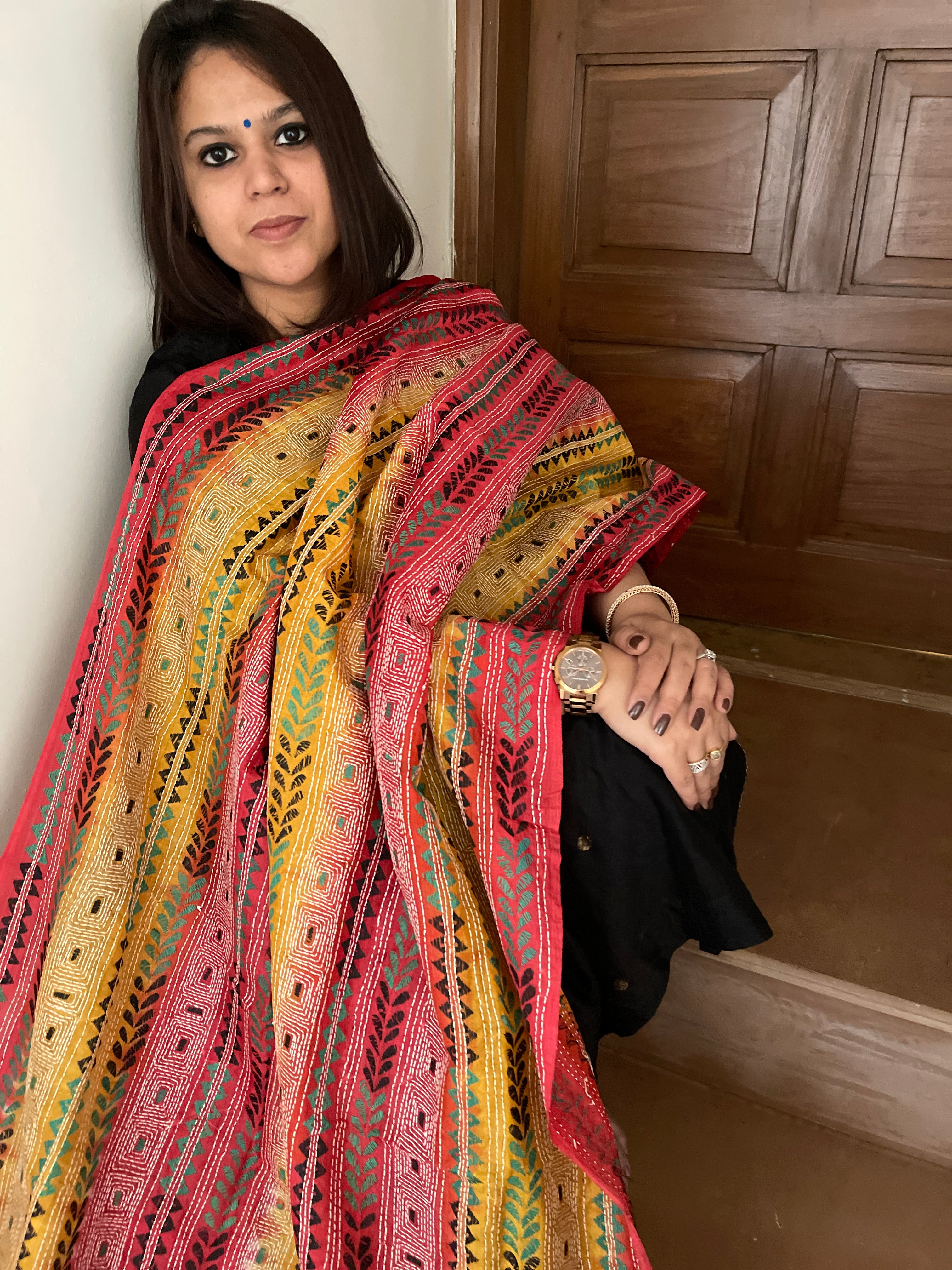 Yellow, Red Handmade Kantha Dupatta in Silk