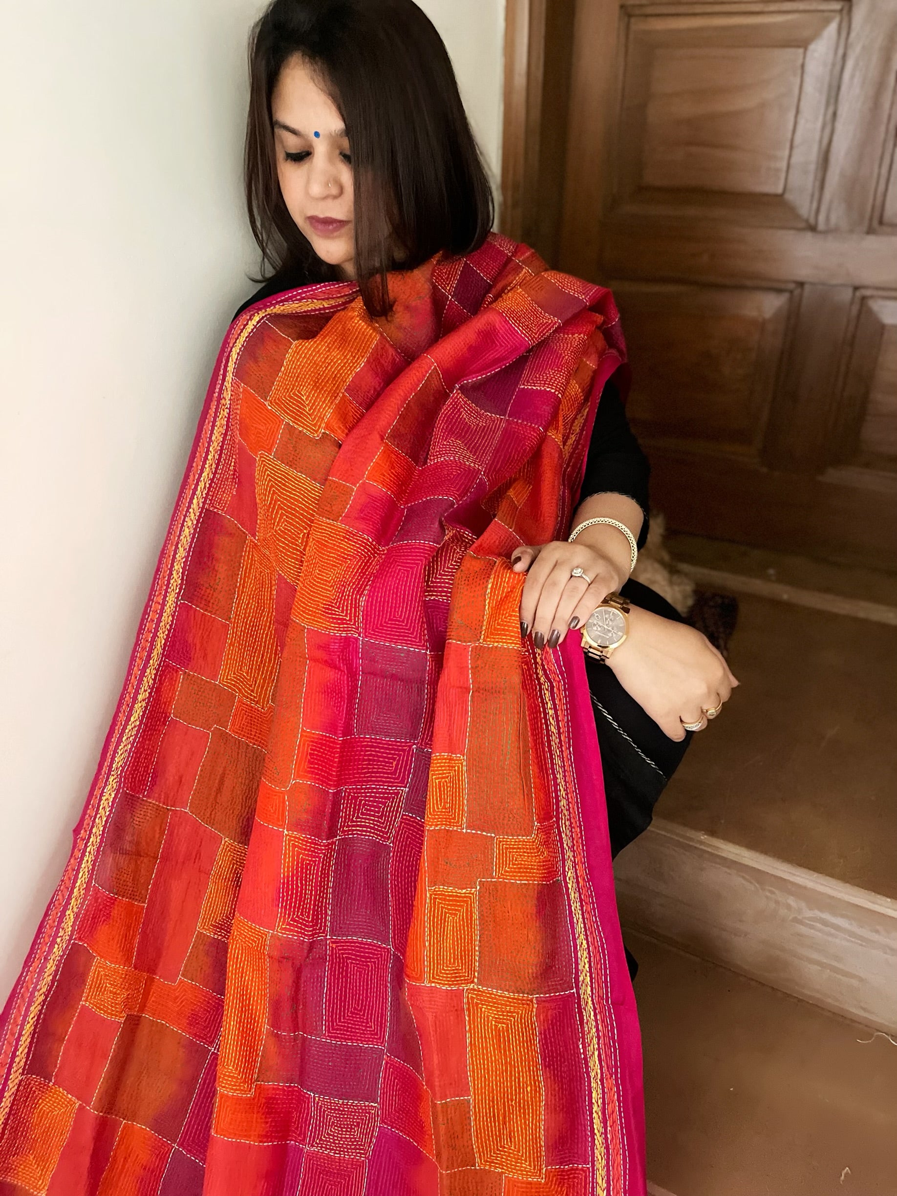 Orange, Pink Handmade Kantha Dupatta in Silk