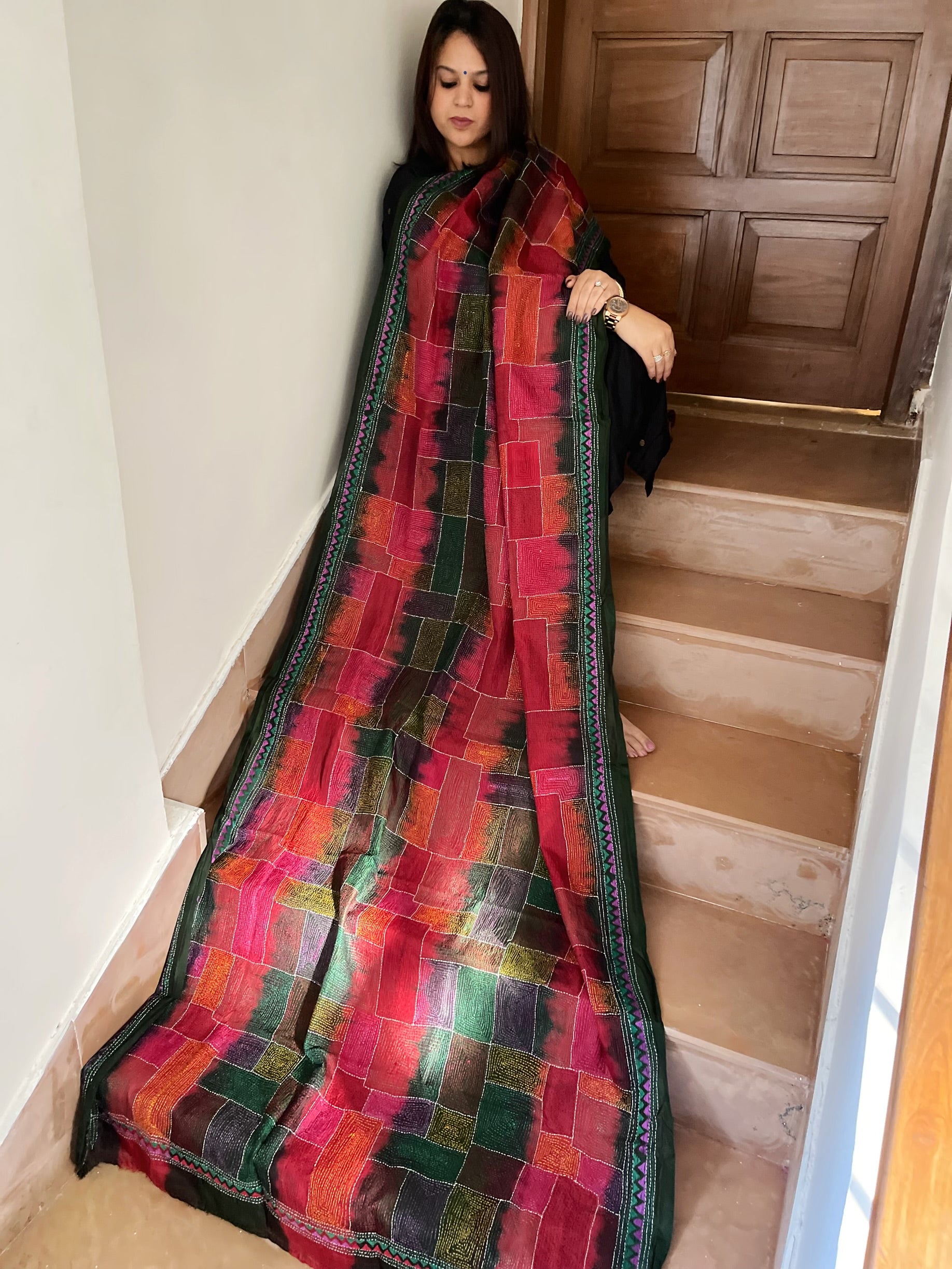 Expertly crafted and truly one-of-a-kind, our Handmade Kantha Dupatta in Silk is a masterpiece. Made from Bangalore silk and beautifully dyed and embroidered by Bengali artisans, each piece is a unique work of art. Elevate your wardrobe with this exquisite accessory.