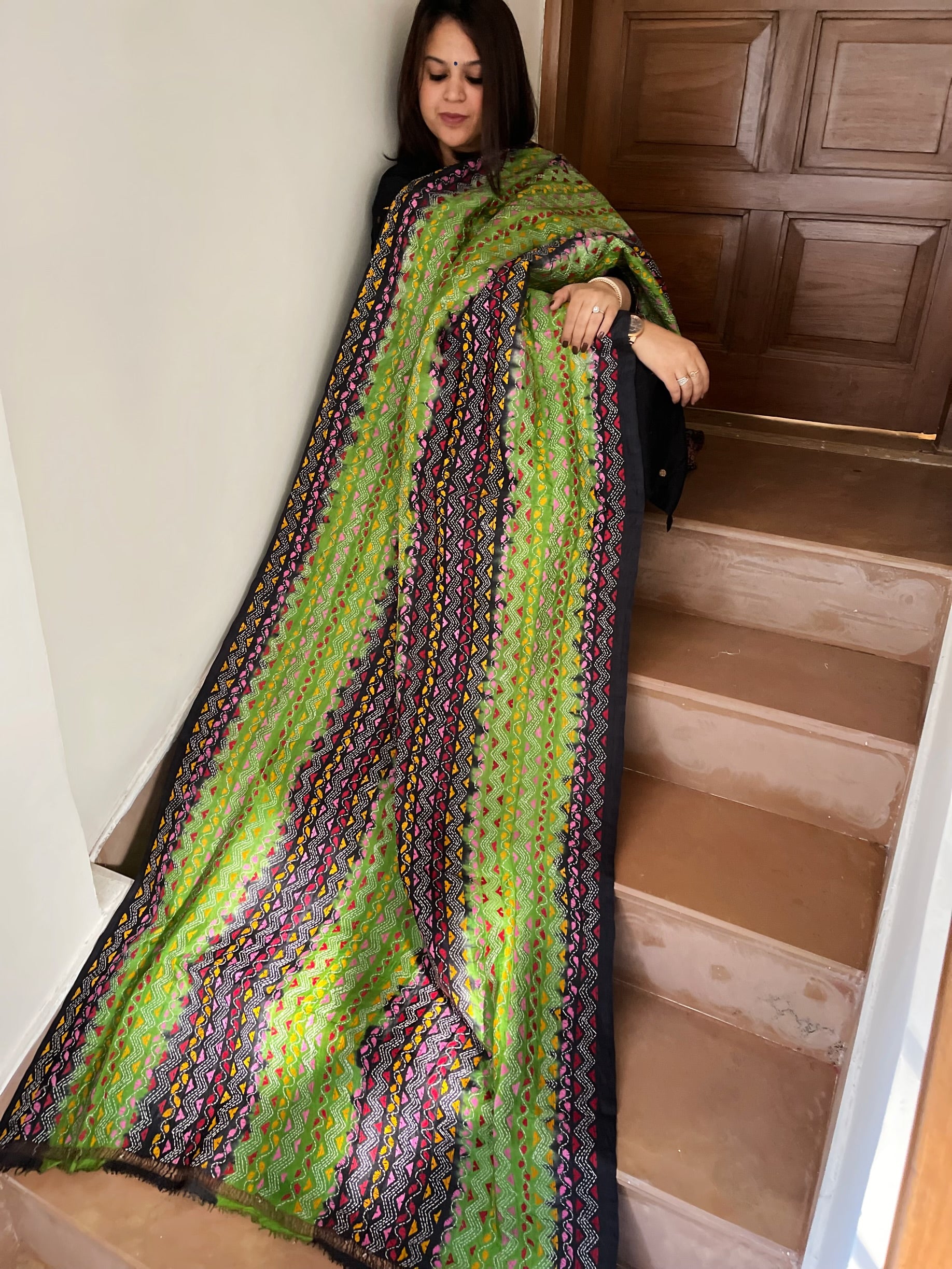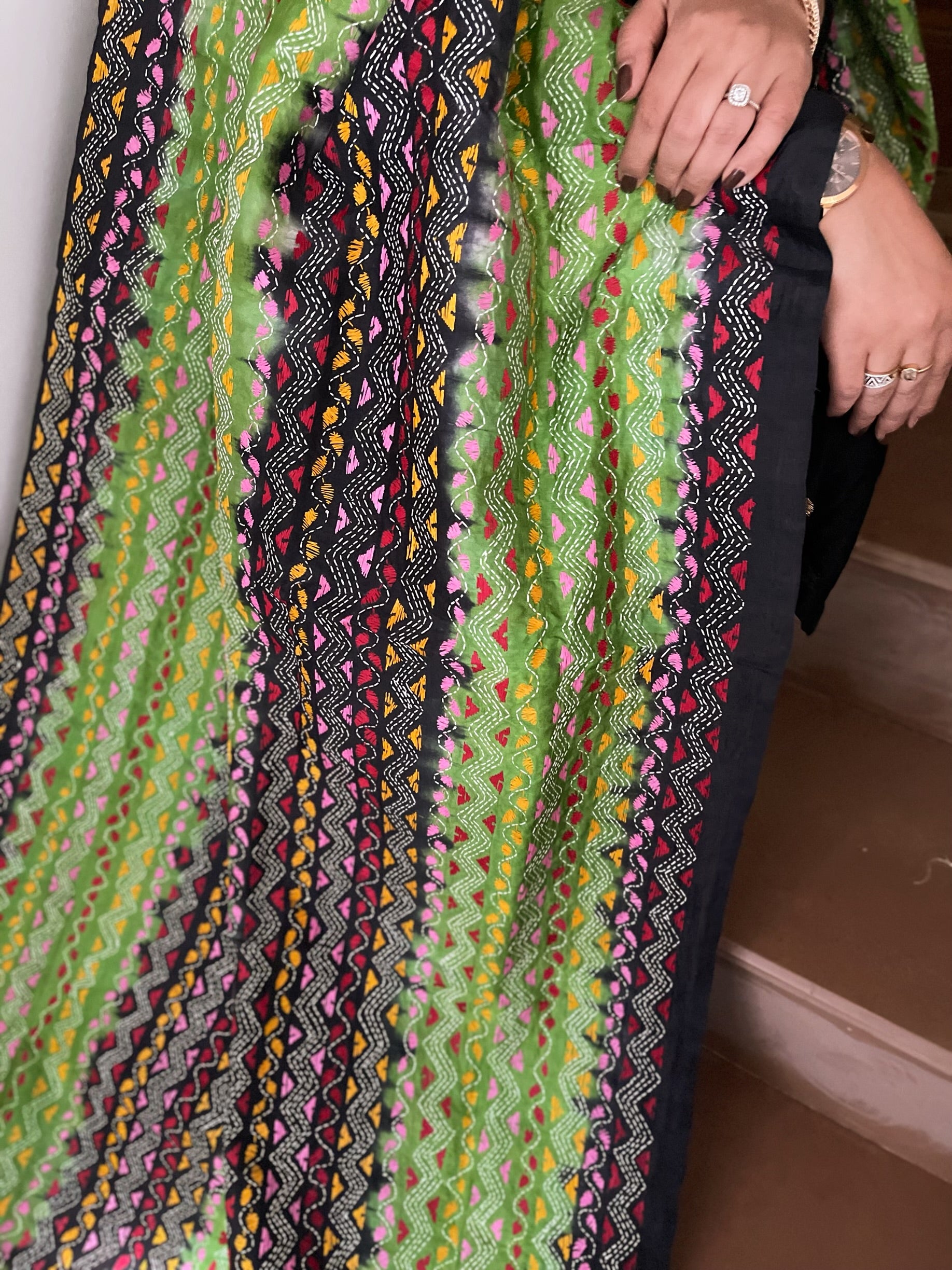 Expertly crafted and truly one-of-a-kind, our Handmade Kantha Dupatta in Silk is a masterpiece. Made from Bangalore silk and beautifully dyed and embroidered by Bengali artisans, each piece is a unique work of art. Elevate your wardrobe with this exquisite accessory.