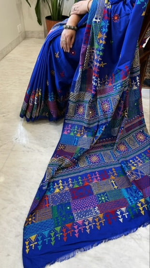This Handmade Lambani Saree showcases intricate hand embroidery meticulously crafted on silk, reflecting traditional Lambani hand artistry. The fine hand embroidery enhances the saree's elegance, making it a timeless piece suitable for special occasions.