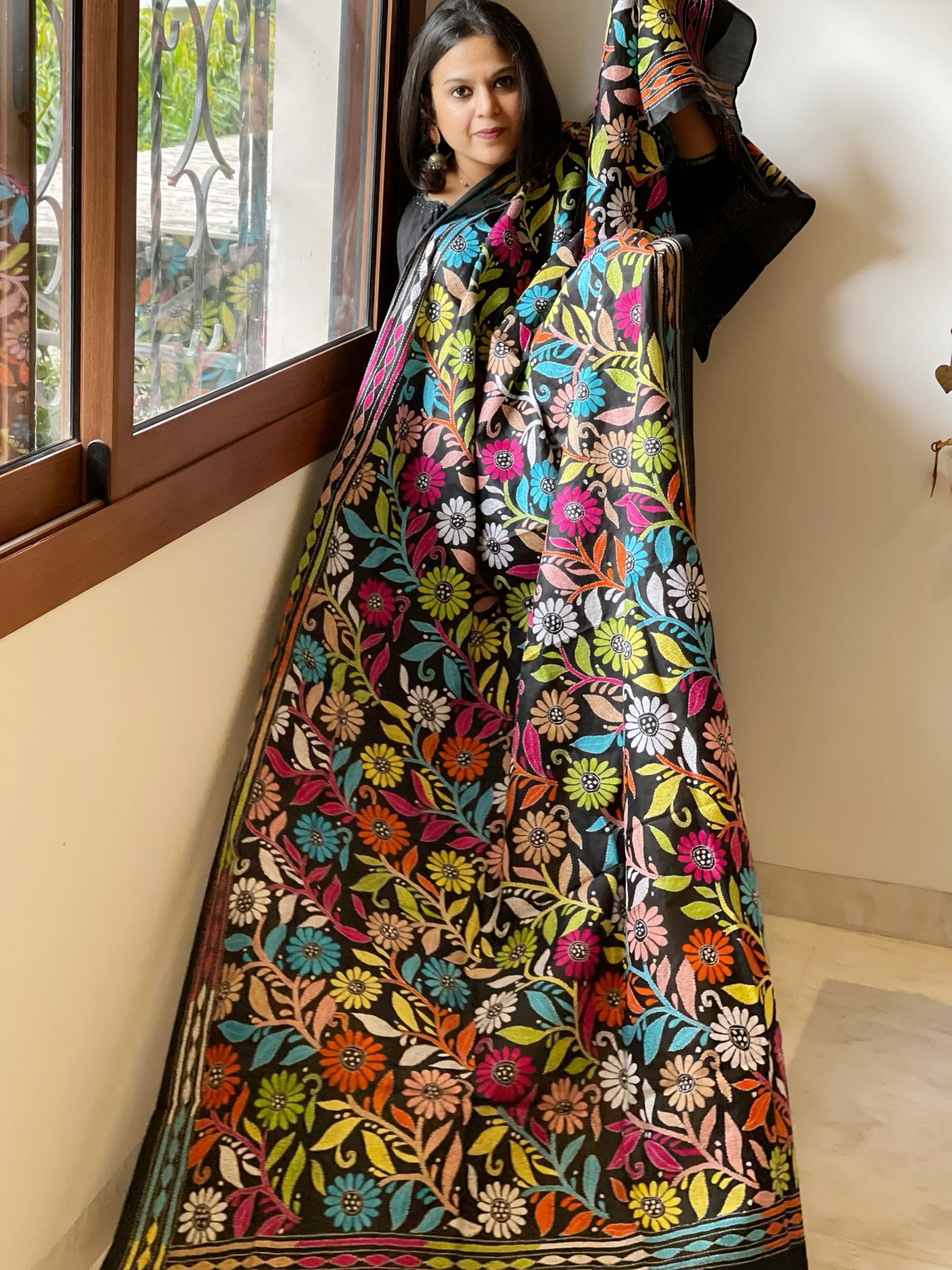 Black Handmade Nakshi Kantha Dupatta in Pure Silk
