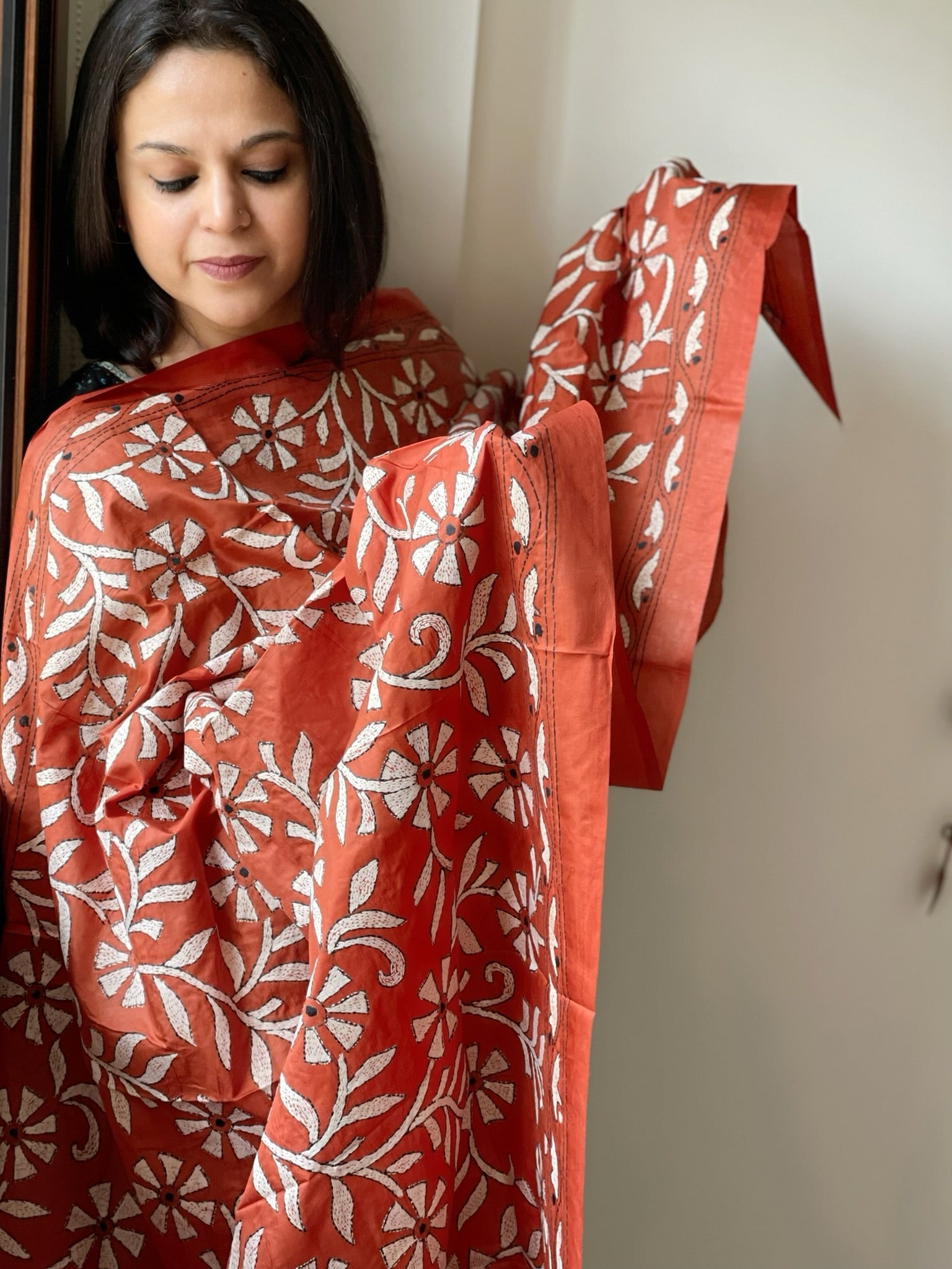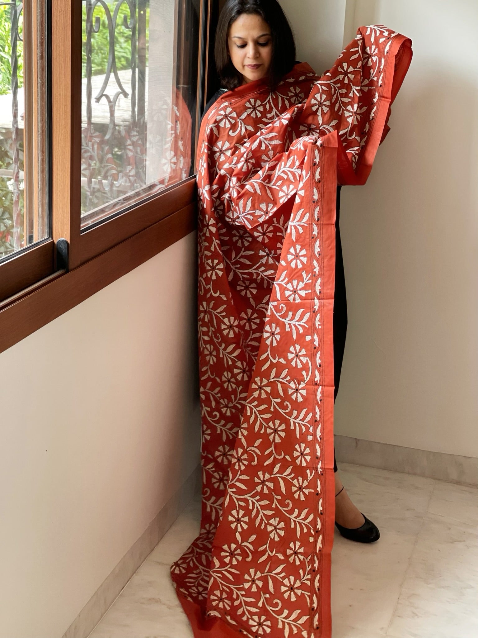 Orange Handmade Nakshi Kantha Dupatta in Pure Silk