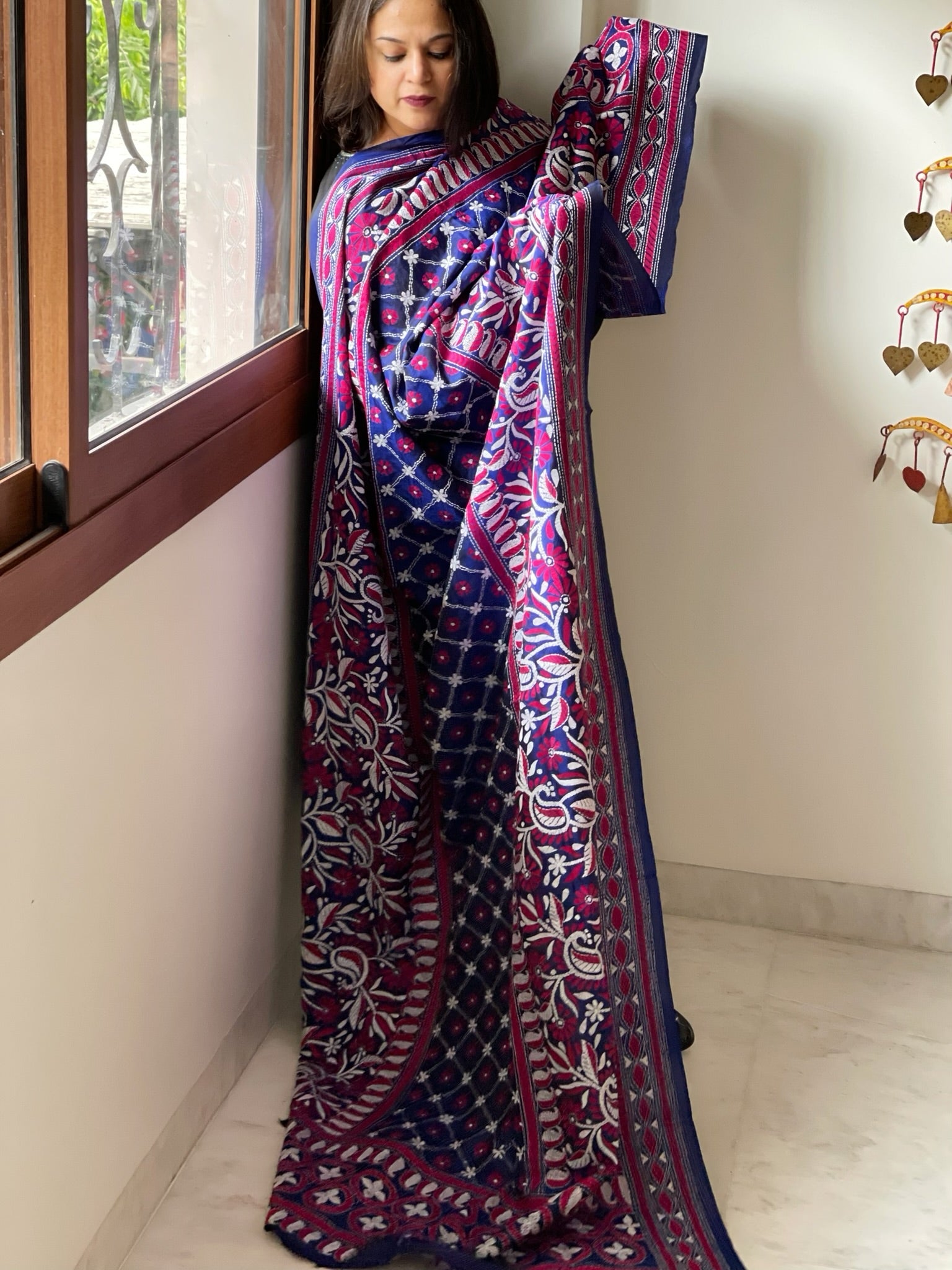 Blue Handmade Nakshi Kantha Dupatta in Pure Silk