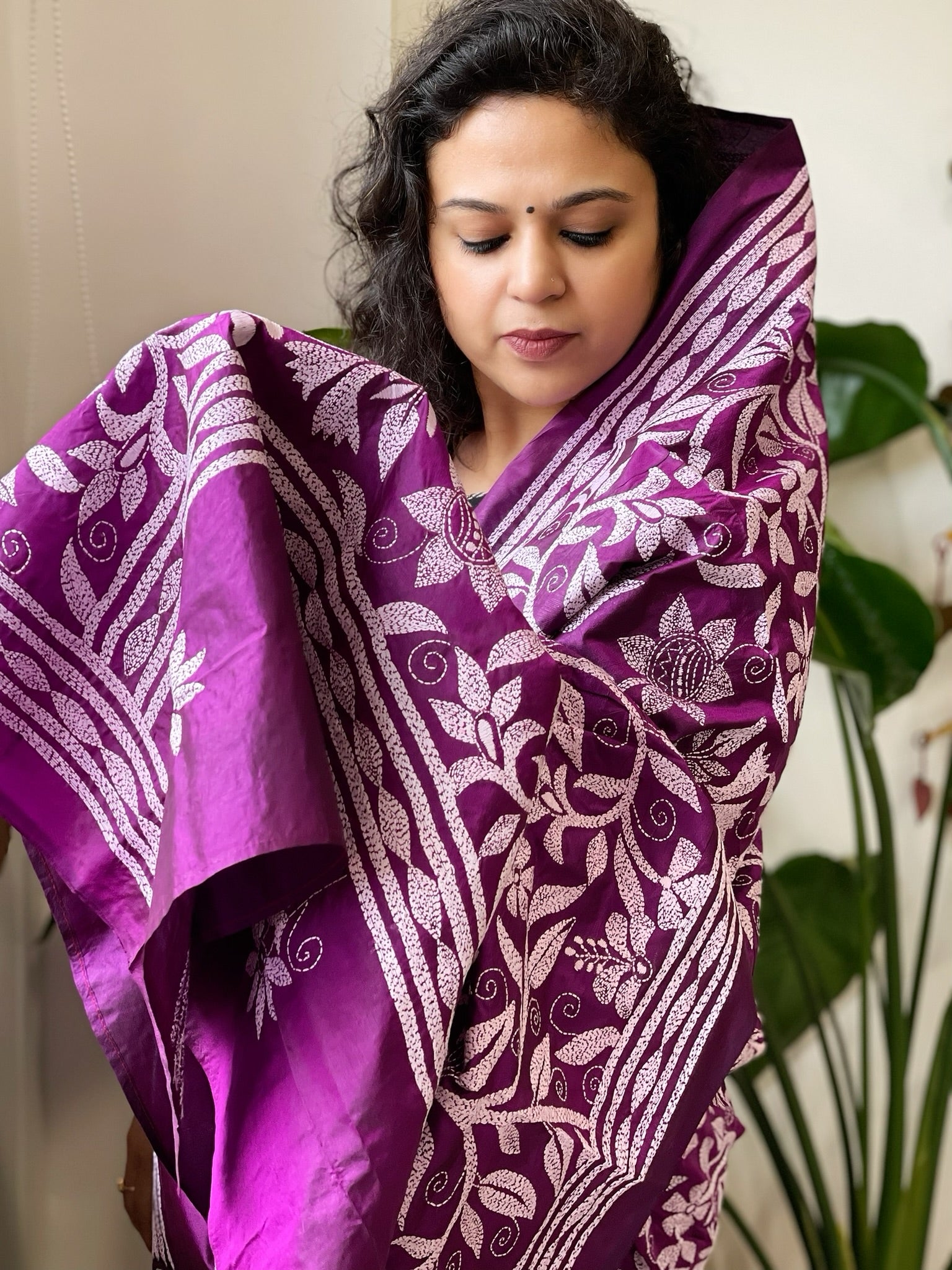 Purple Handmade Nakshi Kantha Dupatta in Pure Silk