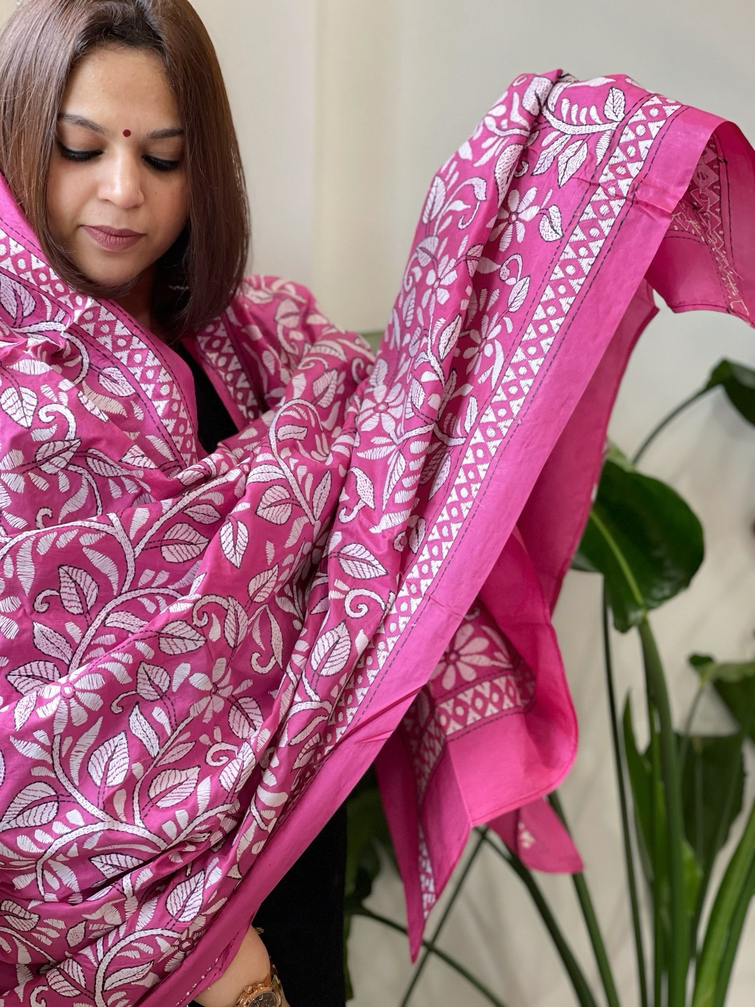 This Handmade Nakshi Kantha Dupatta in Pure Silk is crafted with precision and care by skilled artisans from West Bengal. Made with pure Bangalore silk, it is not only a piece of art but also a unique addition to your wardrobe.