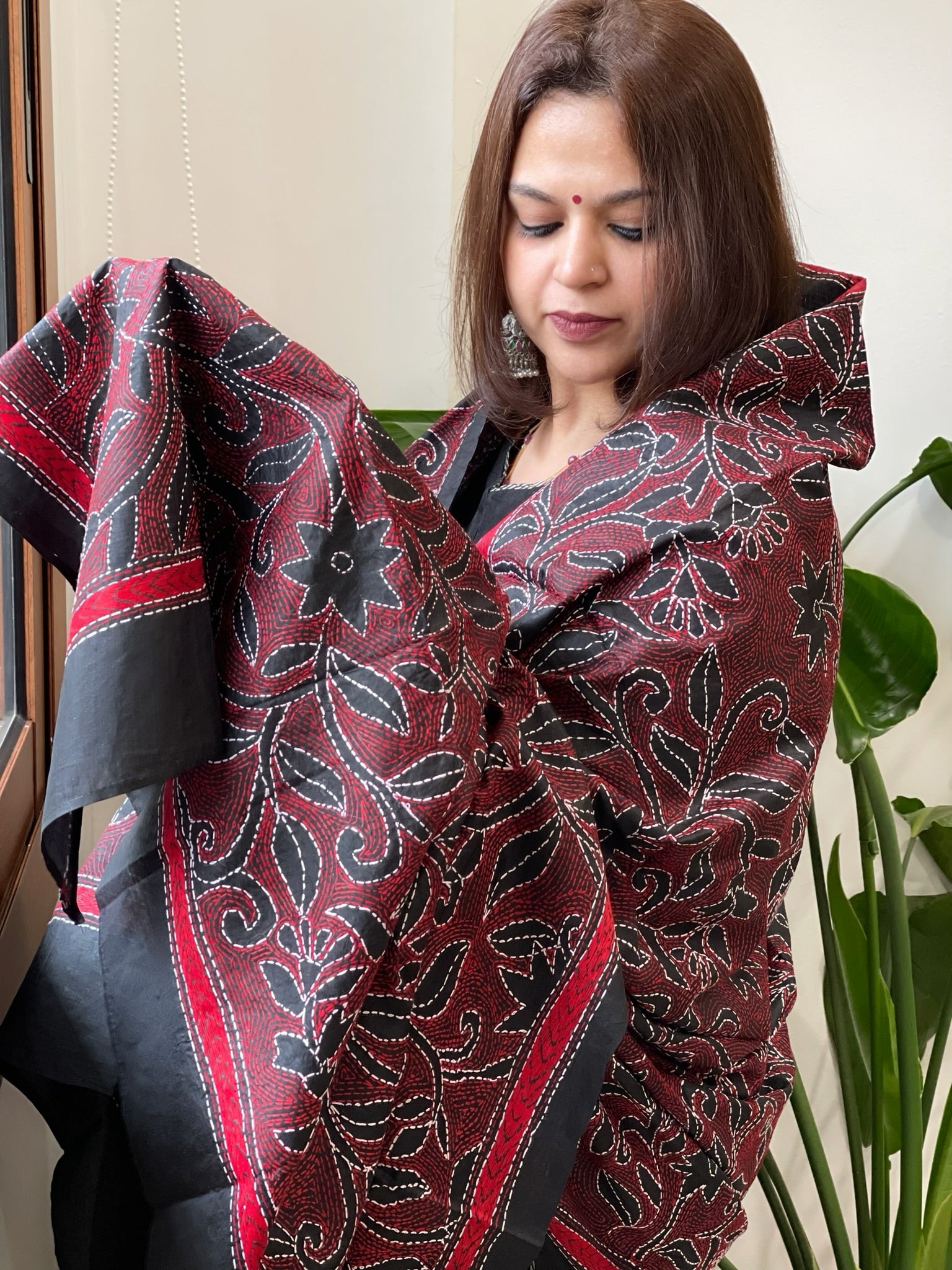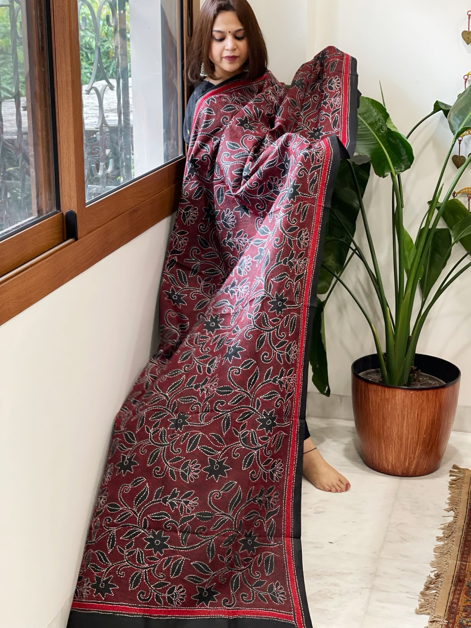 This Handmade Reverse Nakshi Kantha Dupatta in Pure Silk is crafted with precision and care by skilled artisans from West Bengal. Made with pure Bangalore silk, it is not only a piece of art but also a unique addition to your wardrobe.