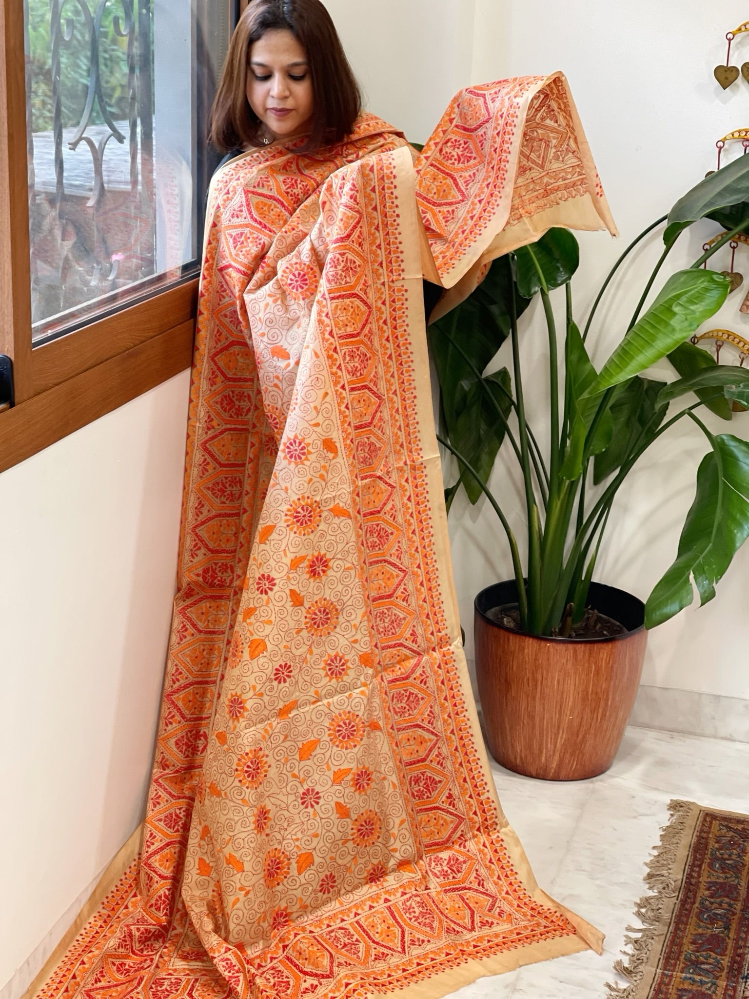 This Handmade Nakshi Kantha Dupatta in Pure Silk is crafted with precision and care by skilled artisans from West Bengal. Made with pure Bangalore silk, it is not only a piece of art but also a unique addition to your wardrobe.