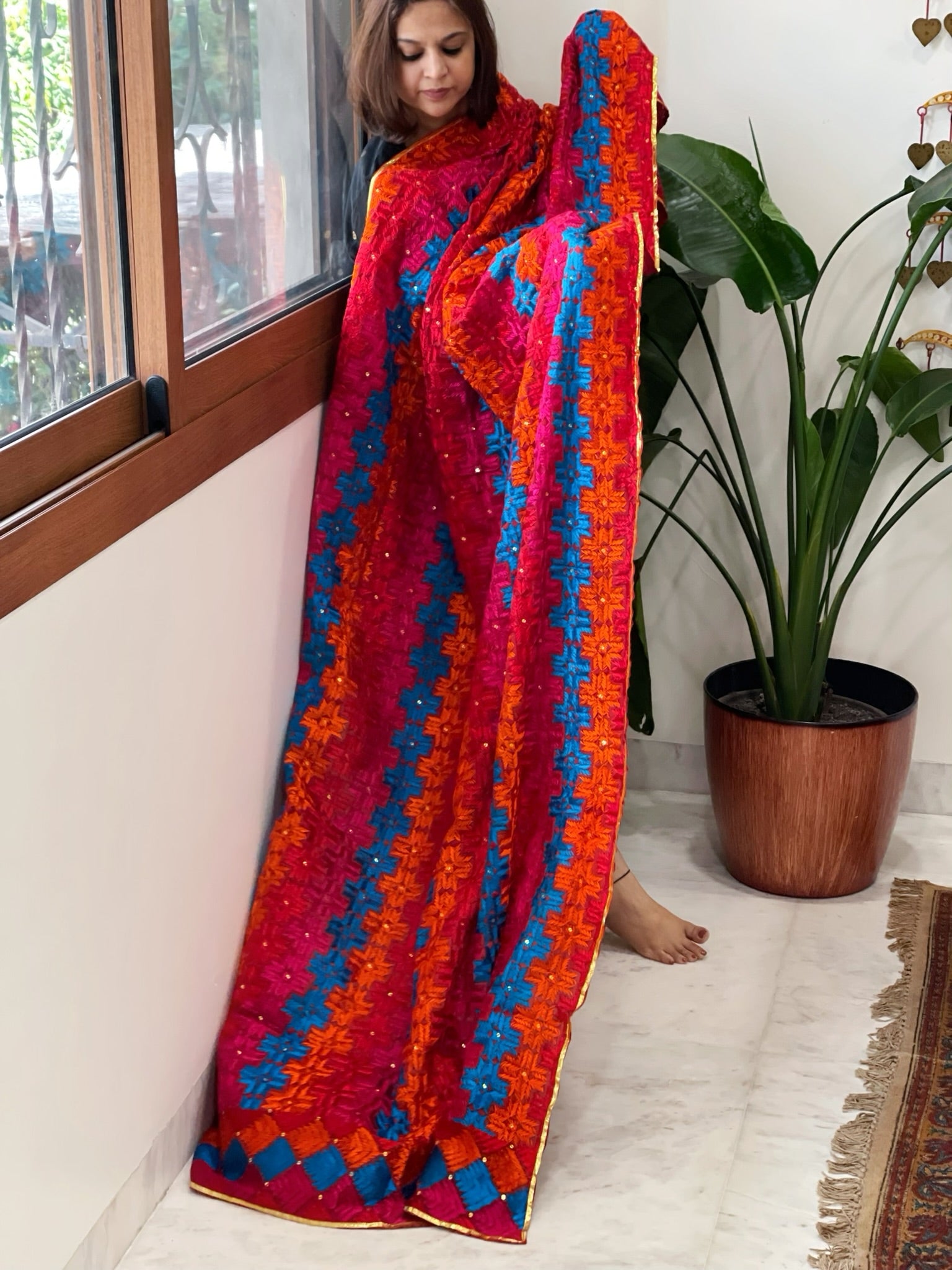This Handmade Phulkari Dupatta is crafted in pure cotton, providing both authenticity and comfort for any occasion. Its vibrant design adds a festive touch to any outfit. Handmade with precision, these dupattas are a must-have for any fashion enthusiast.