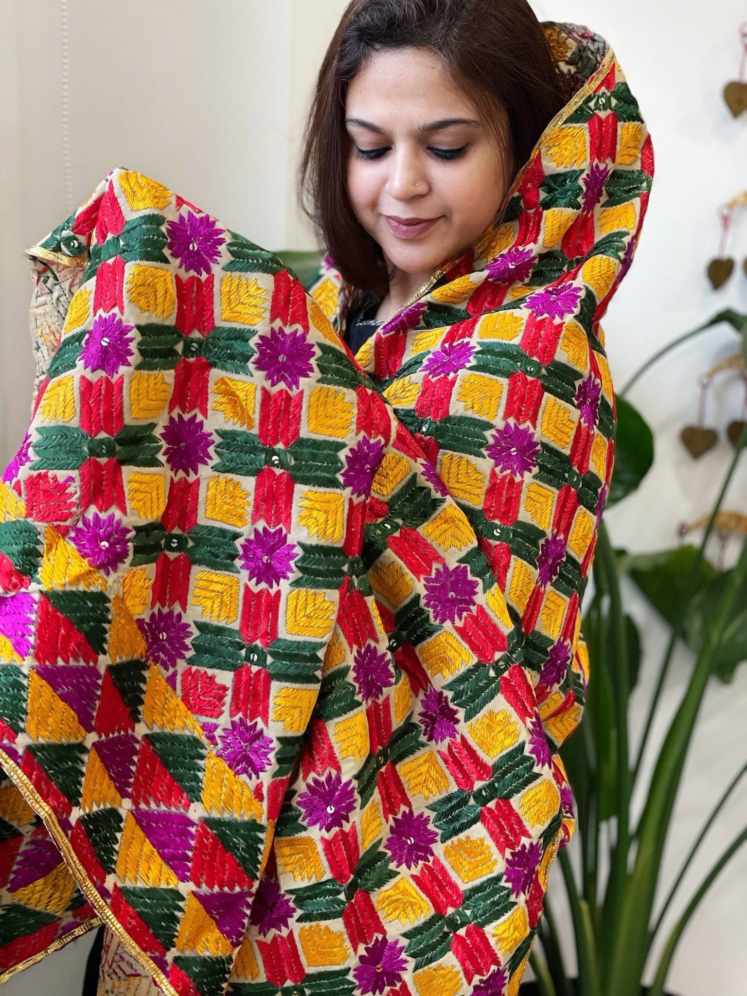 This Handmade Phulkari Dupatta is crafted in pure cotton, providing both authenticity and comfort for any occasion. Its vibrant design adds a festive touch to any outfit. Handmade with precision, these dupattas are a must-have for any fashion enthusiast.