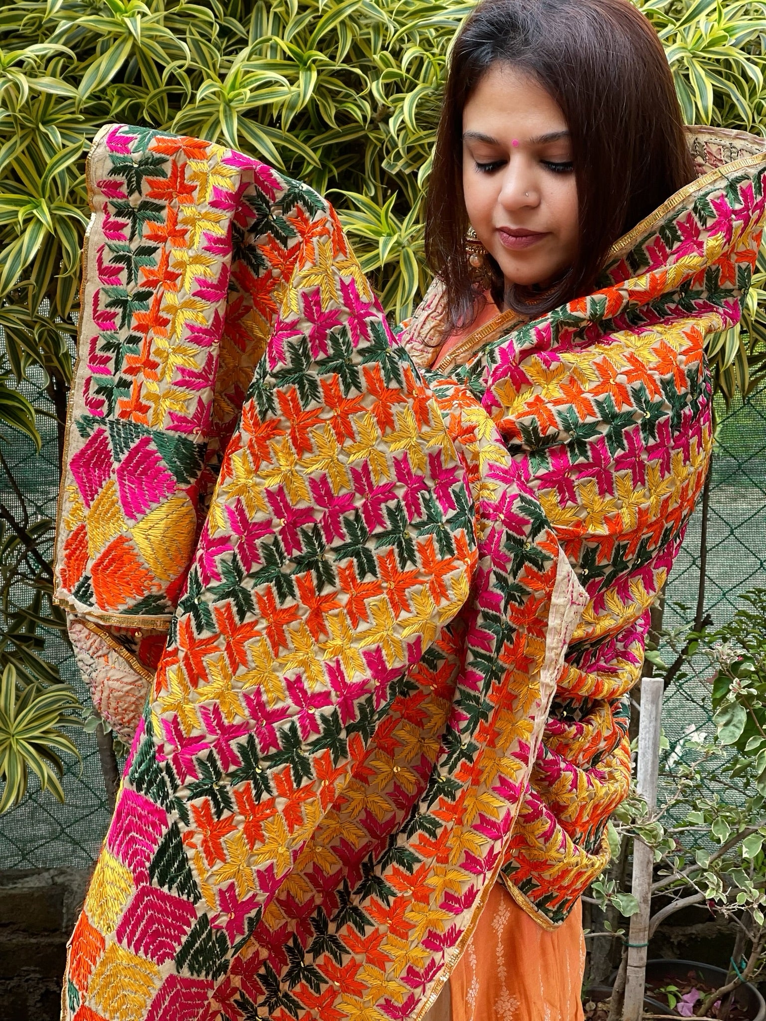 This Handmade Phulkari Dupatta is crafted in pure cotton, providing both authenticity and comfort for any occasion. Its vibrant design adds a festive touch to any outfit. Handmade with precision, these dupattas are a must-have for any fashion enthusiast.