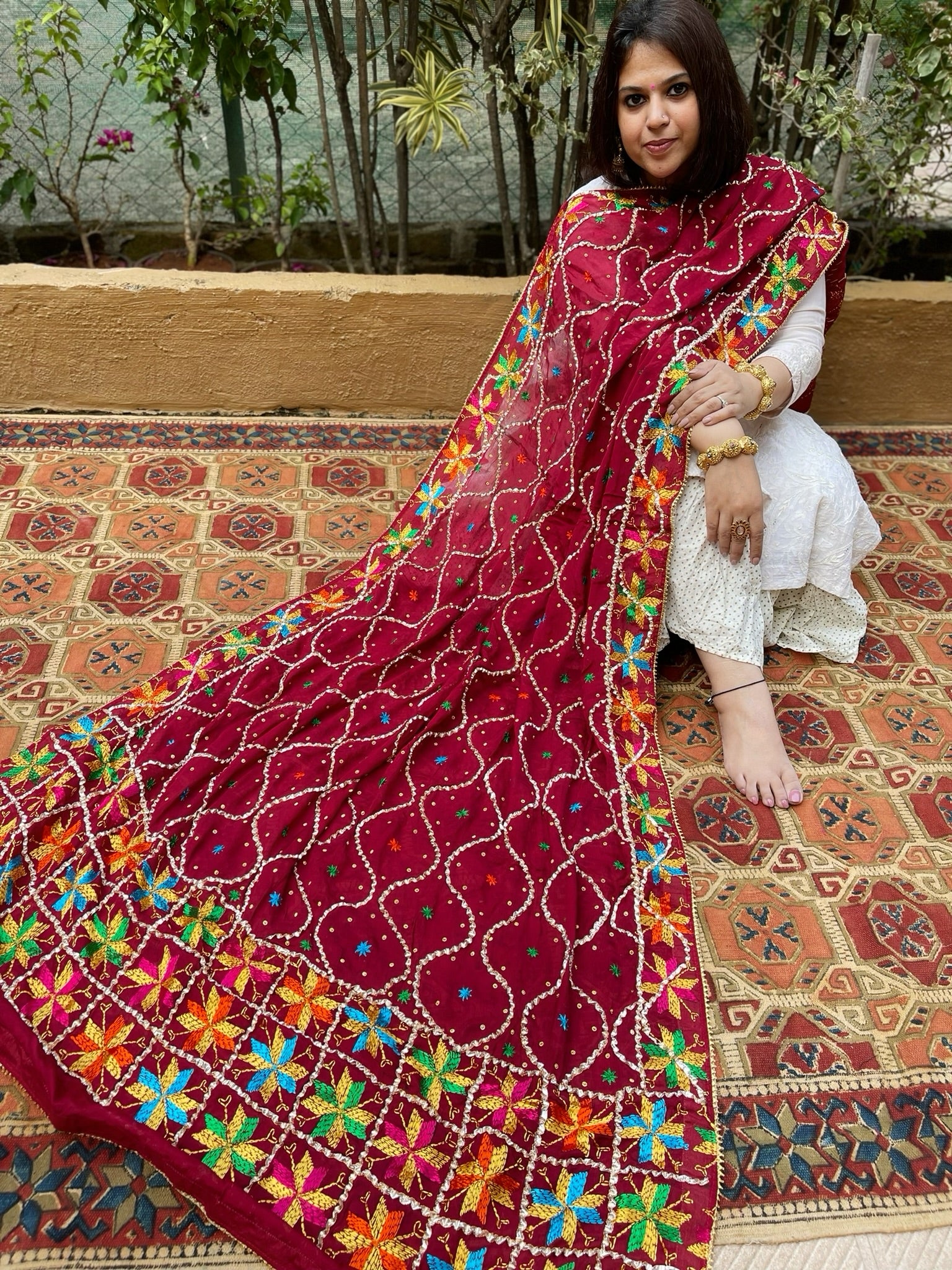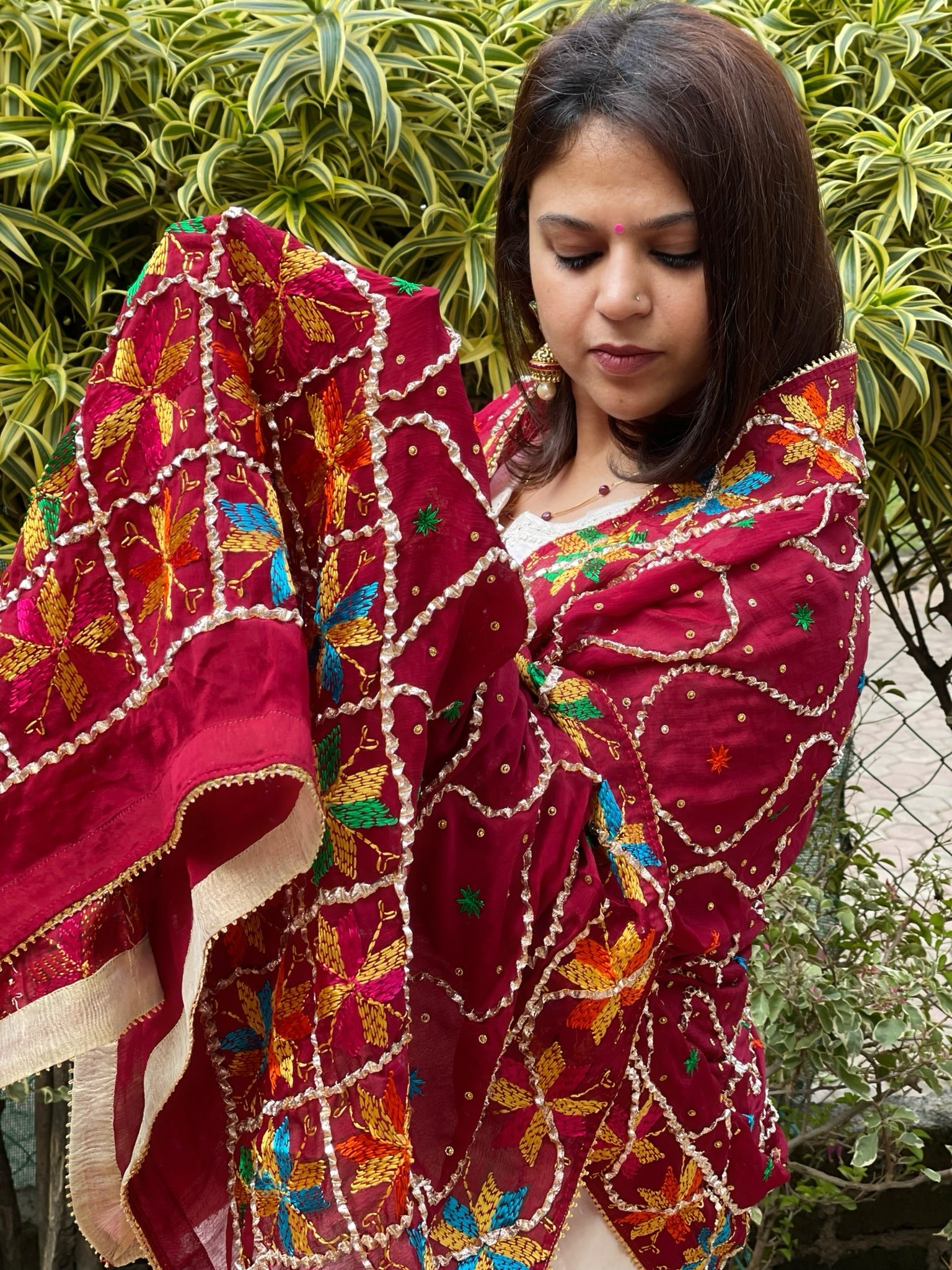 Maroon Handmade Phulkari Dupatta in Pure Chinon with Gota Handwork