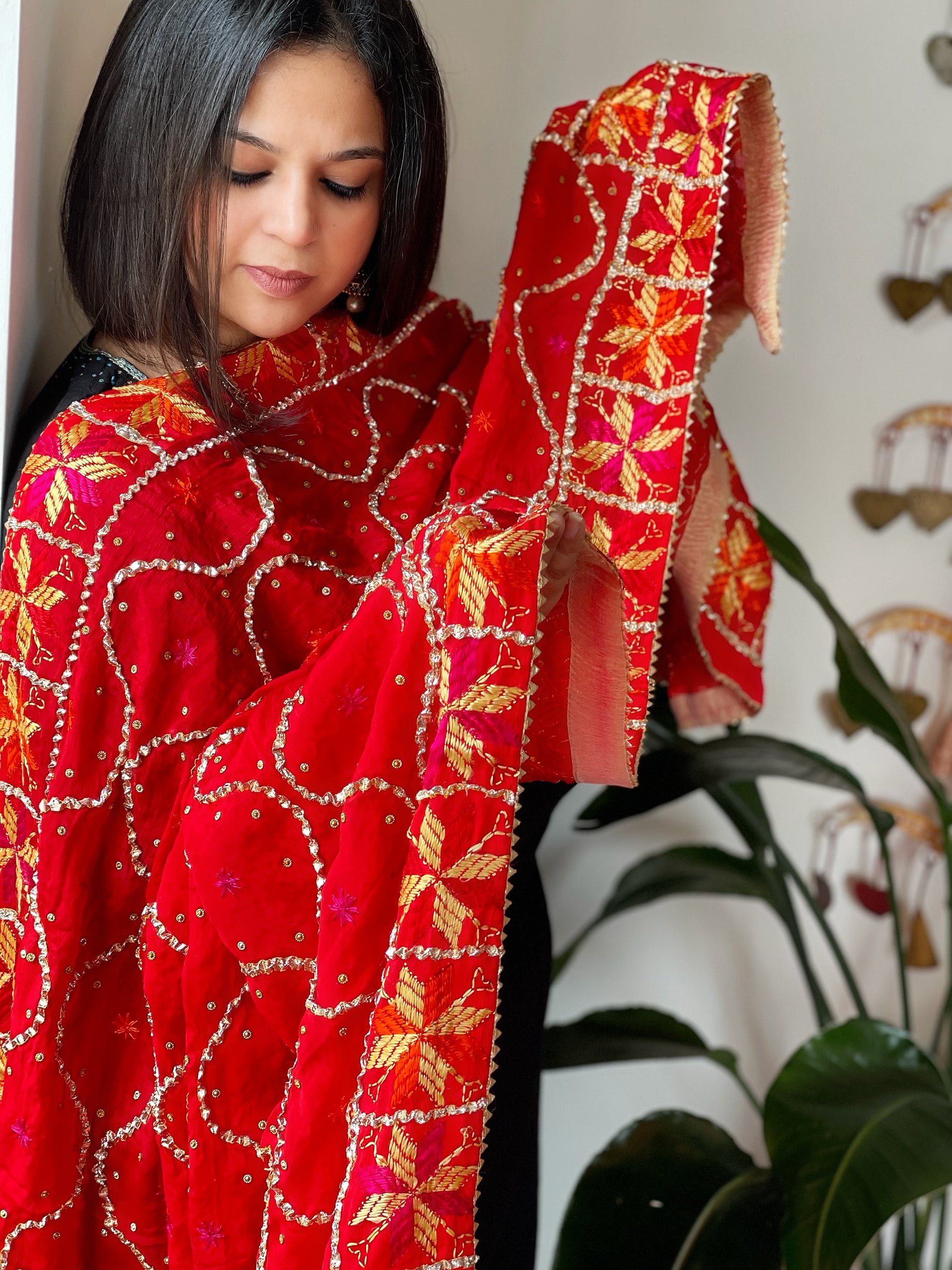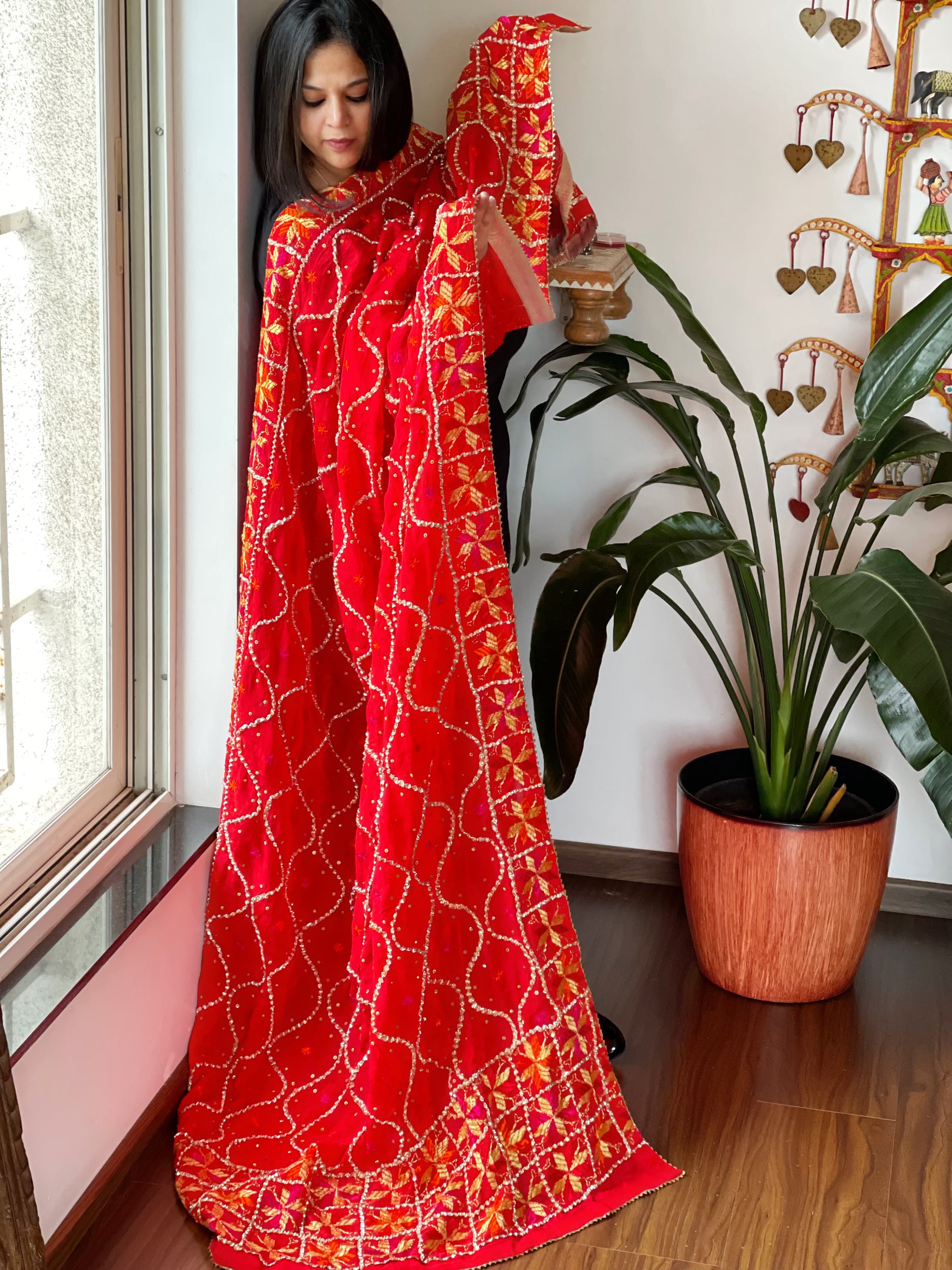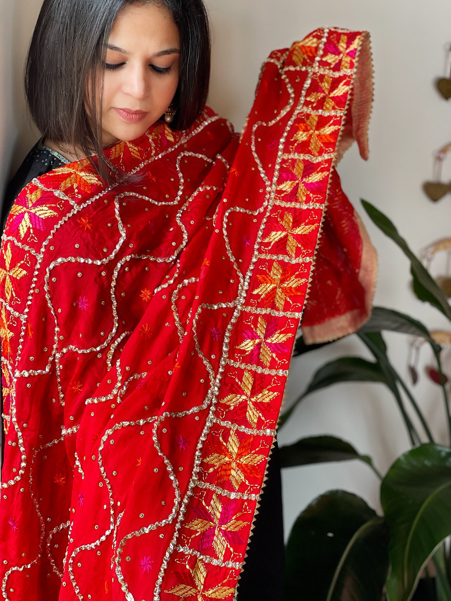 Red Handmade Phulkari Dupatta in Pure Chinon with Gota Handwork