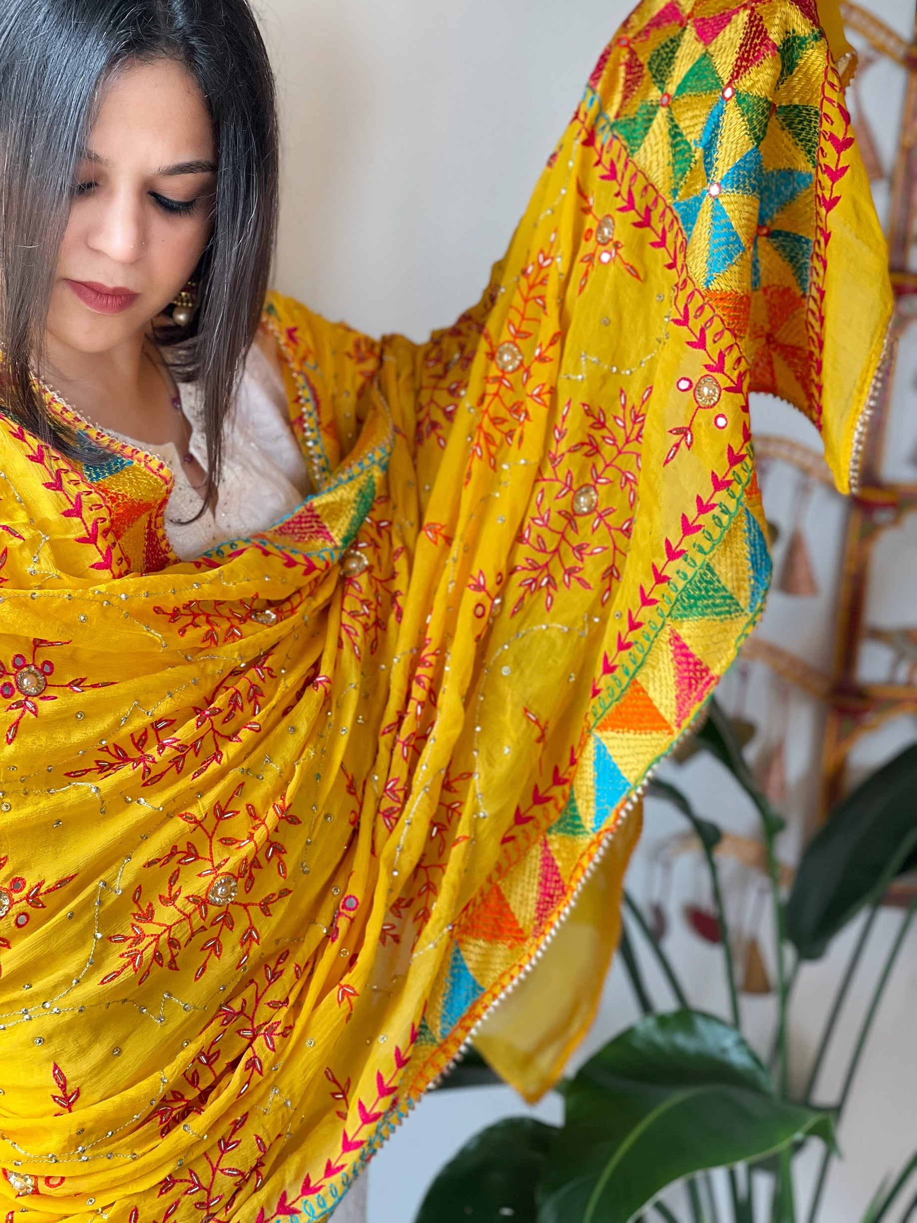 This Handmade Phulkari Dupatta is a beautiful and unique piece of art. Made with intricate gotapatti handwork on pure Chinon, it showcases the authentic craft from Punjab.