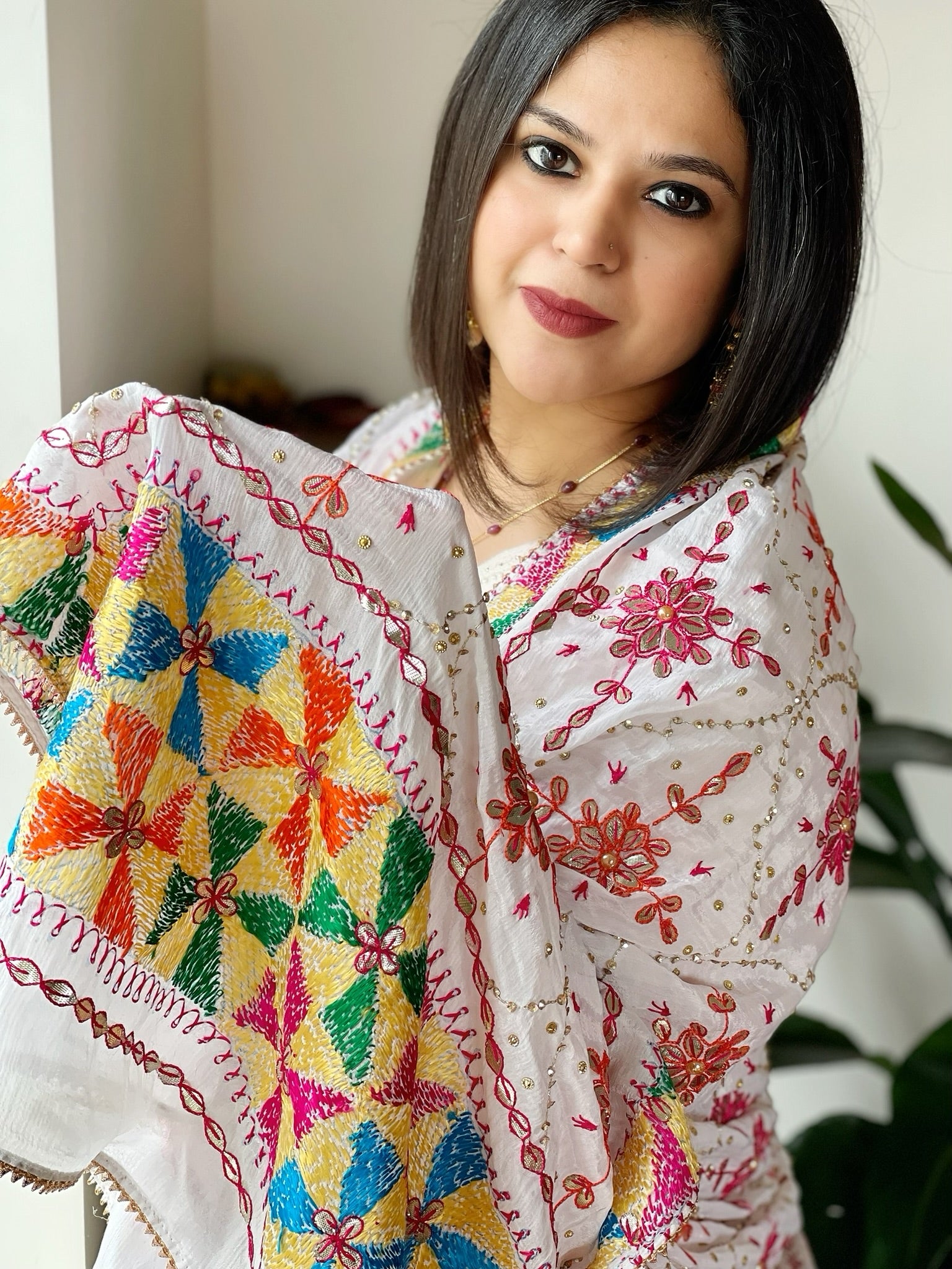 White Handmade Phulkari Dupatta in Pure Chinon with Gotapatti Handwork