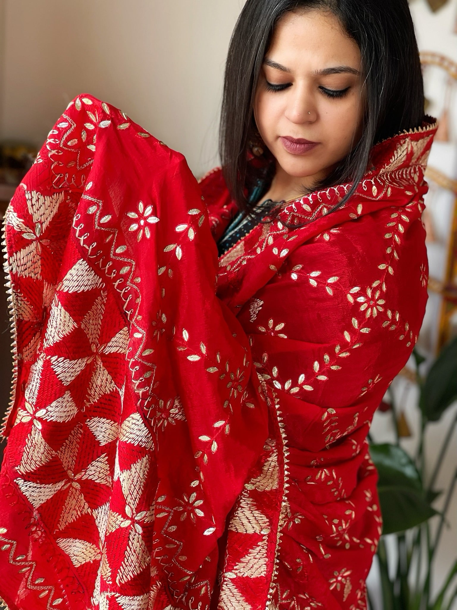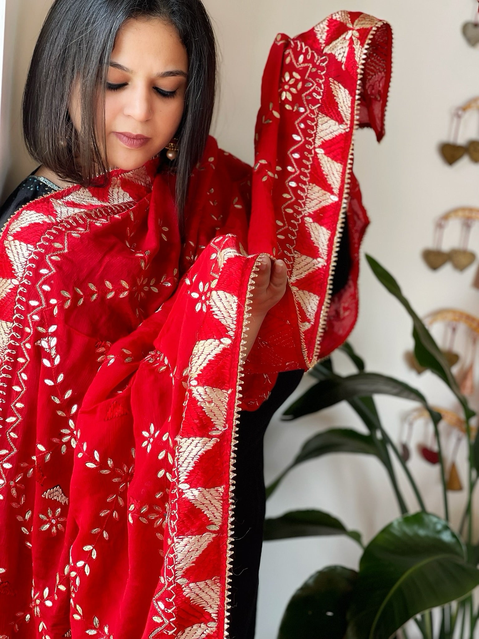 Red Handmade Phulkari Dupatta in Pure Chinon with Gotapatti Handwork