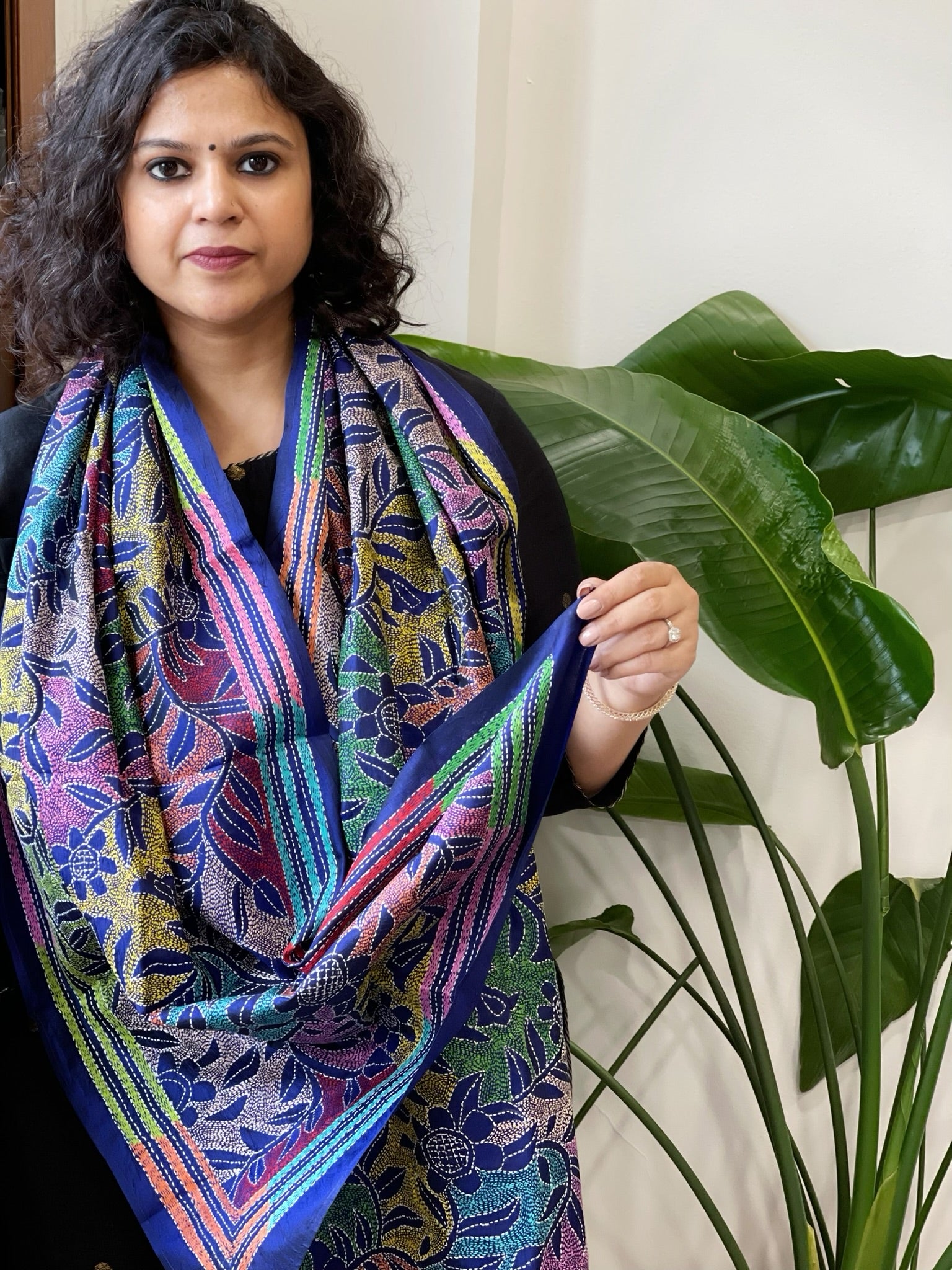 Electric Blue Handmade Reverse Nakshi Kantha Stole in Pure Silk