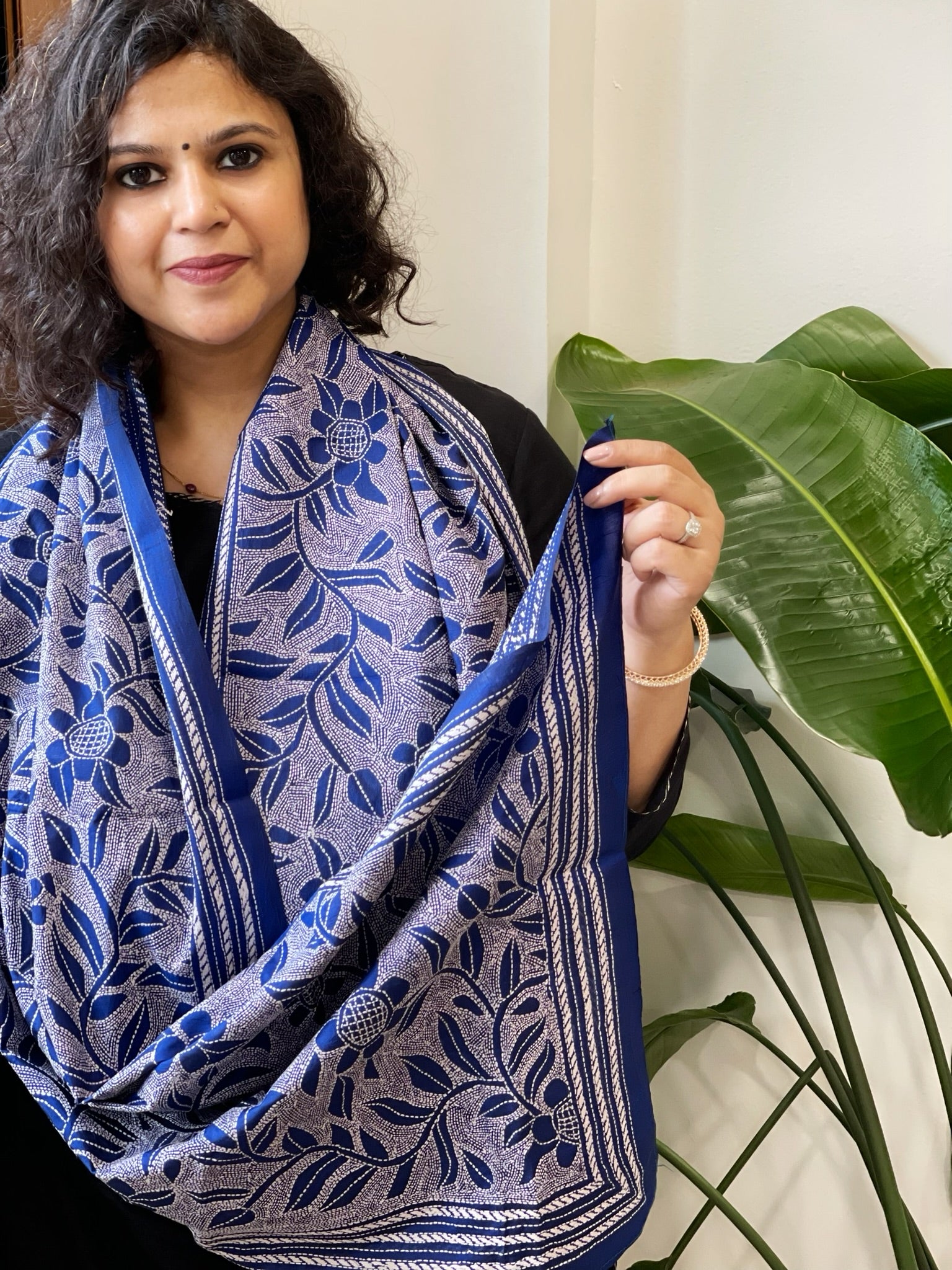 Blue Handmade Reverse Nakshi Kantha Stole in Pure Silk