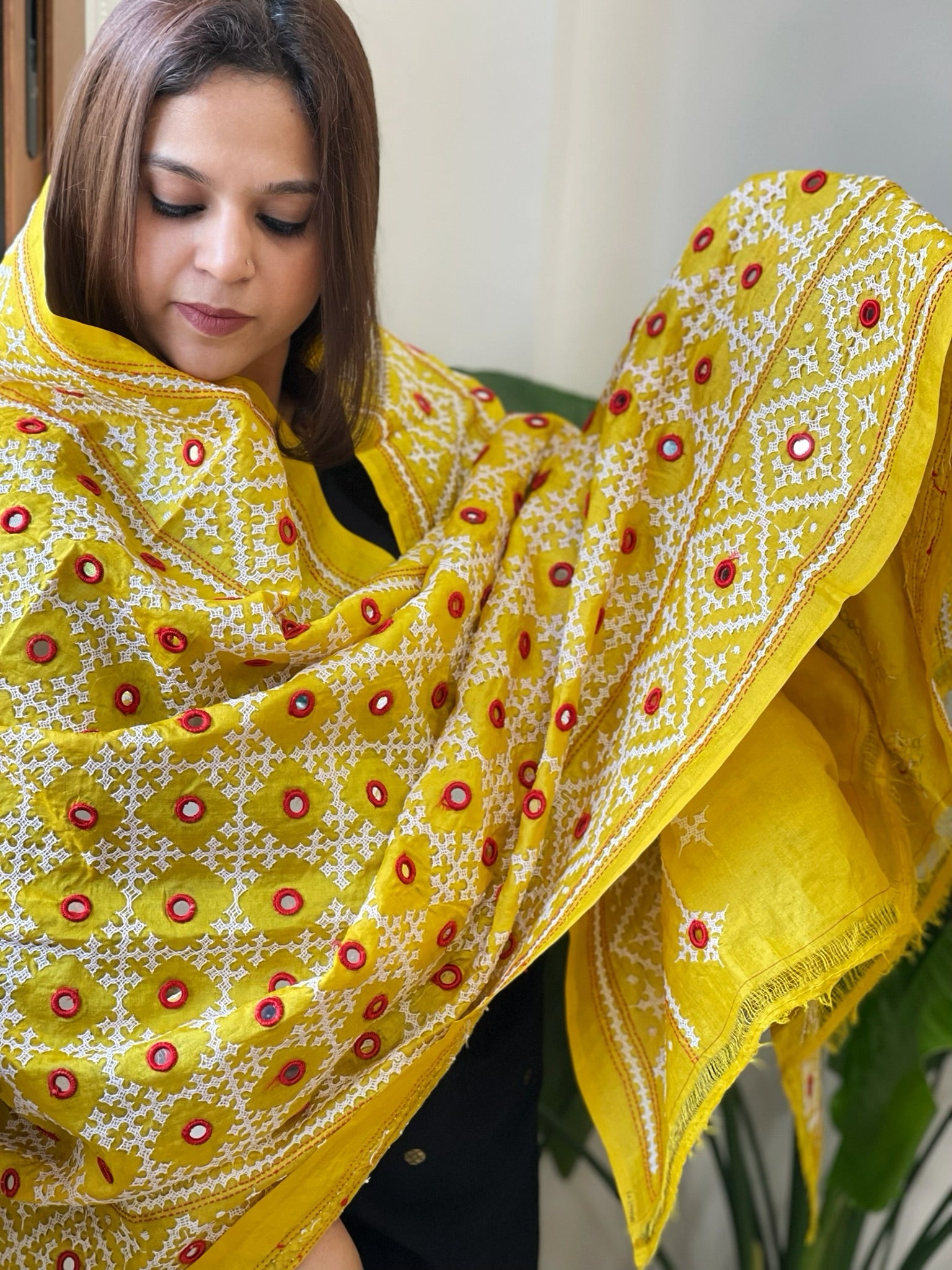 Yellow Handmade Sindhi Kadhai with Real Mirror Handwork Dupatta in Pure Silk