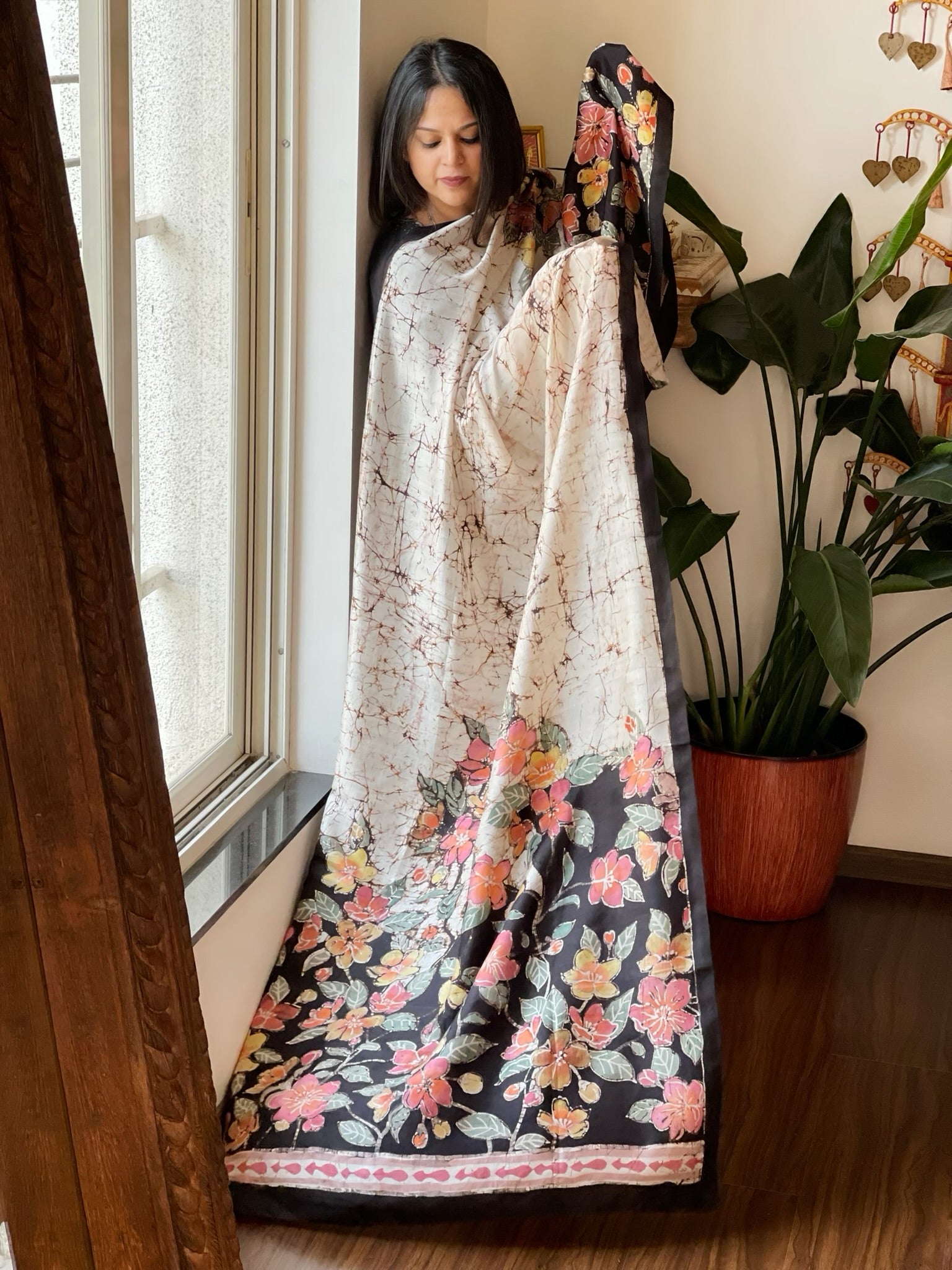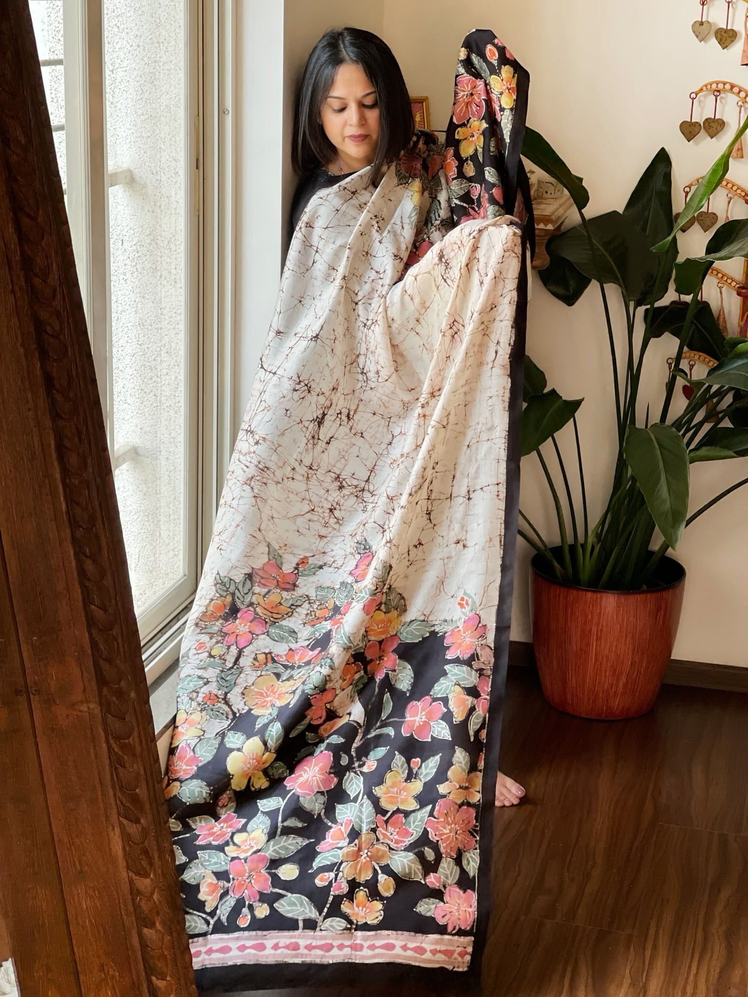Handpainted & Batik Hand Dyed Dupatta in Handwoven Mul Silk