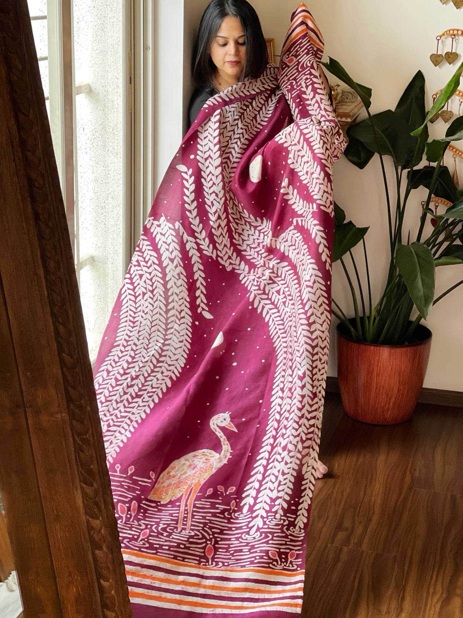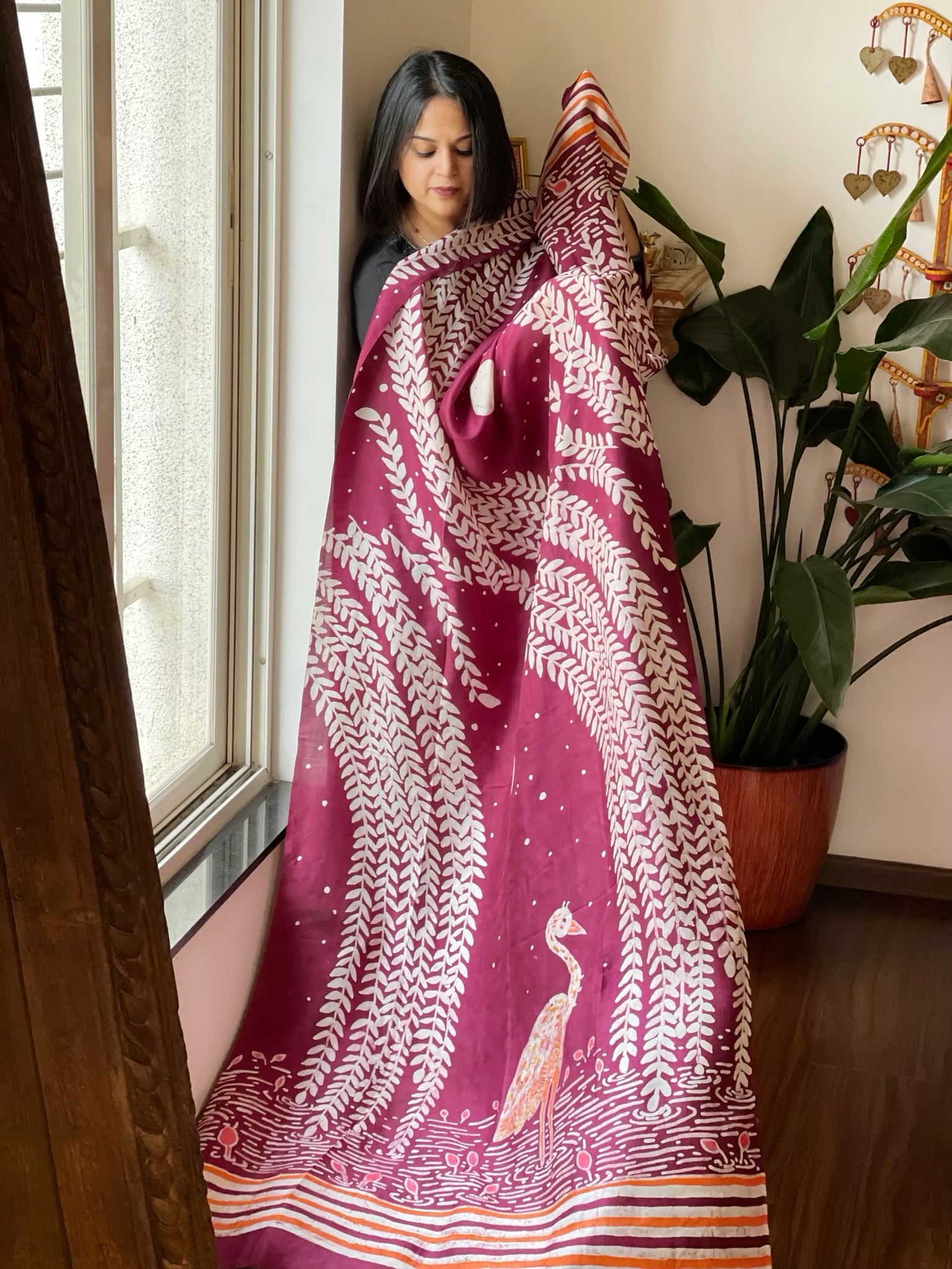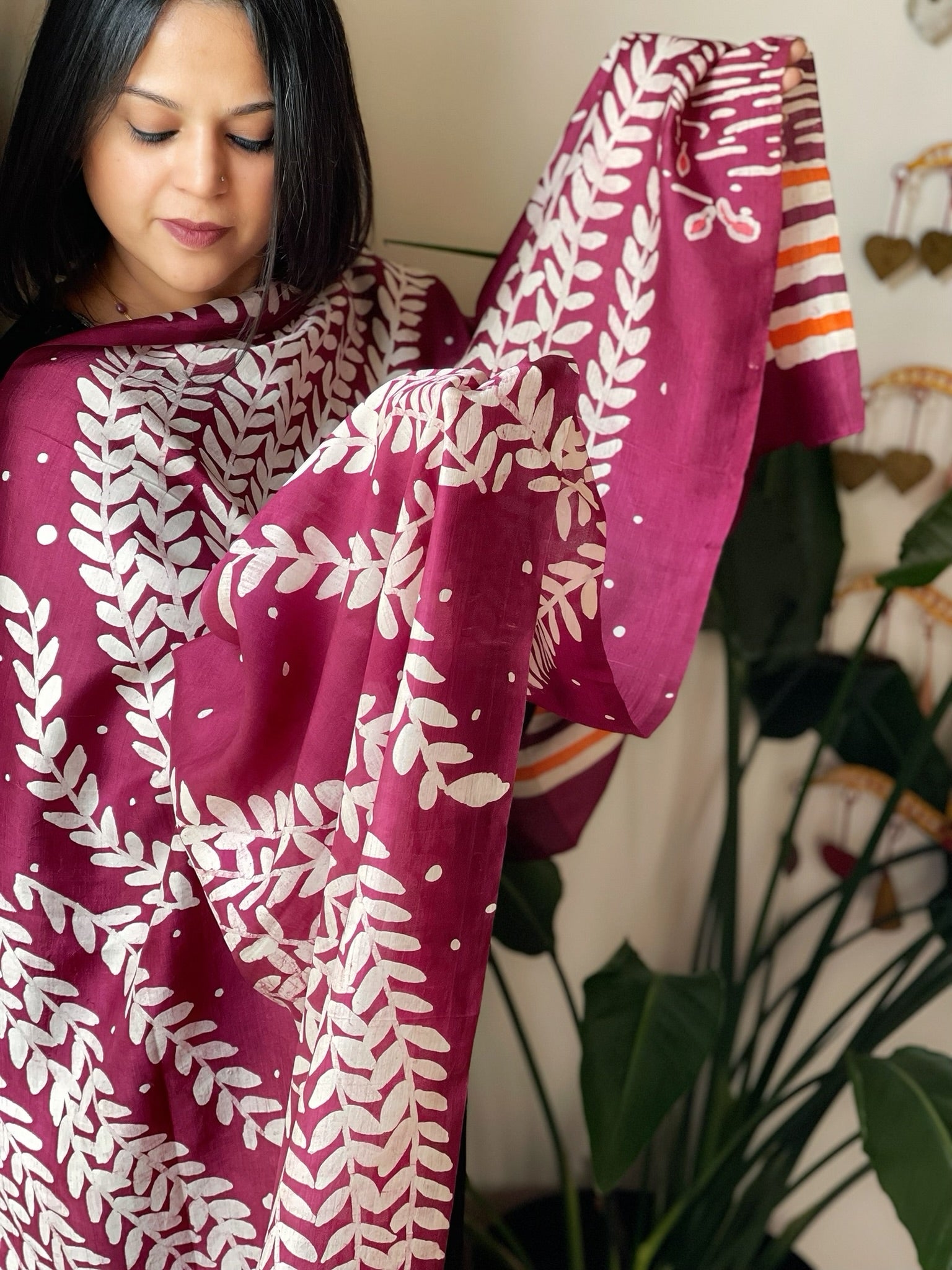 Handpainted & Batik Hand Dyed Dupatta in Handwoven Mul Silk
