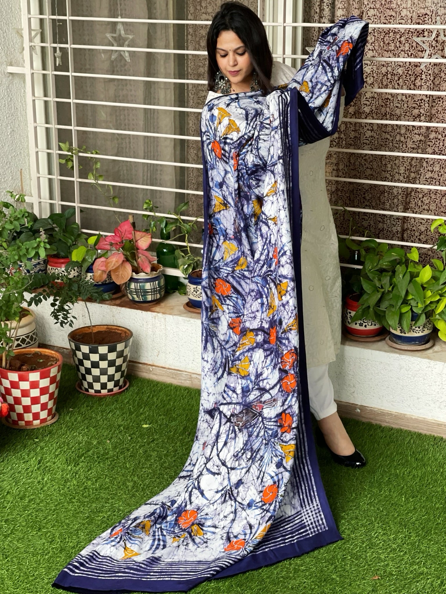 Exclusive Handpainted and Batik Hand Dyed Dupatta in Modal Silk. Each piece is uniquely created and crafted with superior modal silk fabric, making it a statement.;