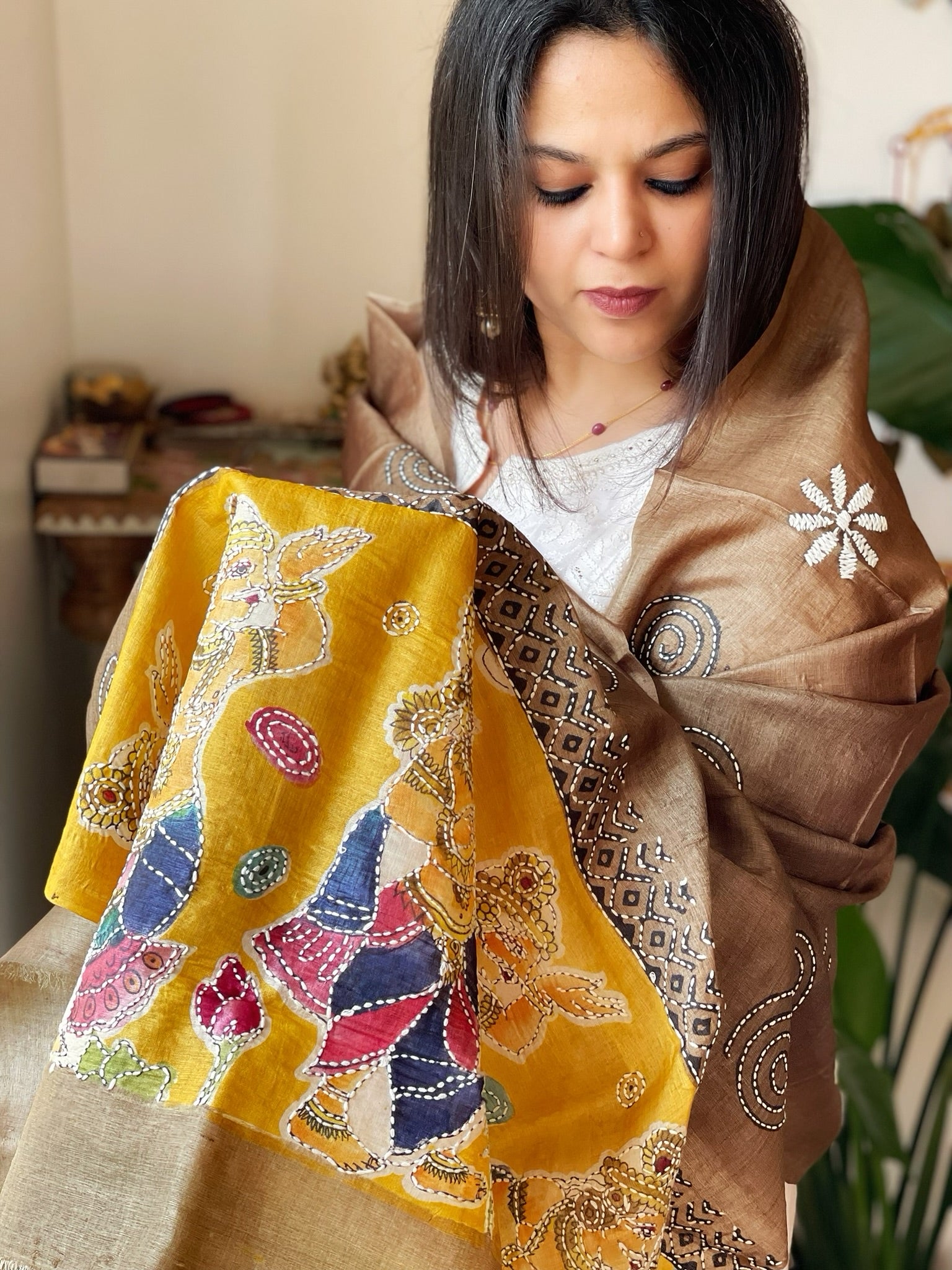 Golden Brown Handpainted Dupatta with Kantha Hand Embroidery in Pure Silk