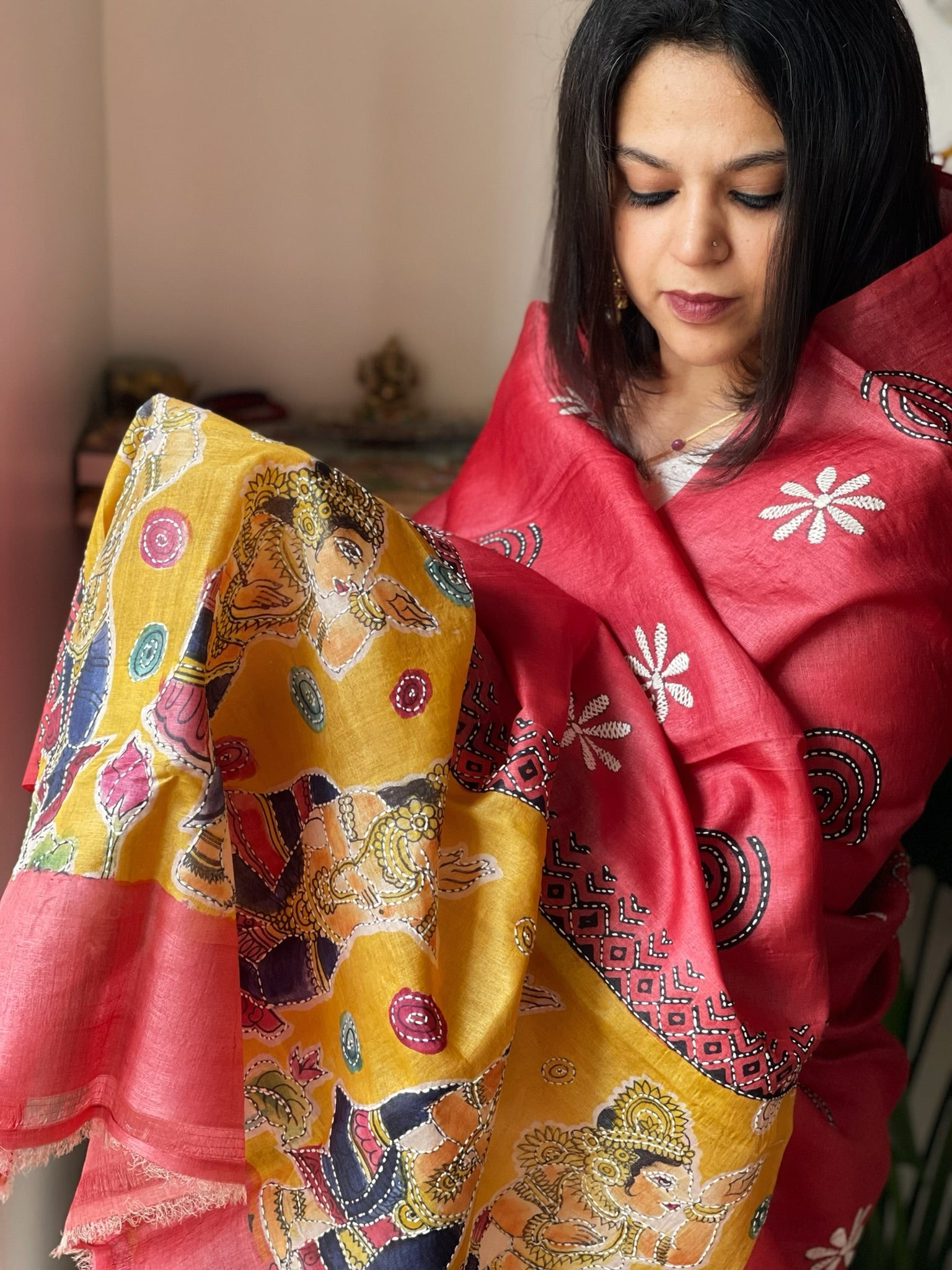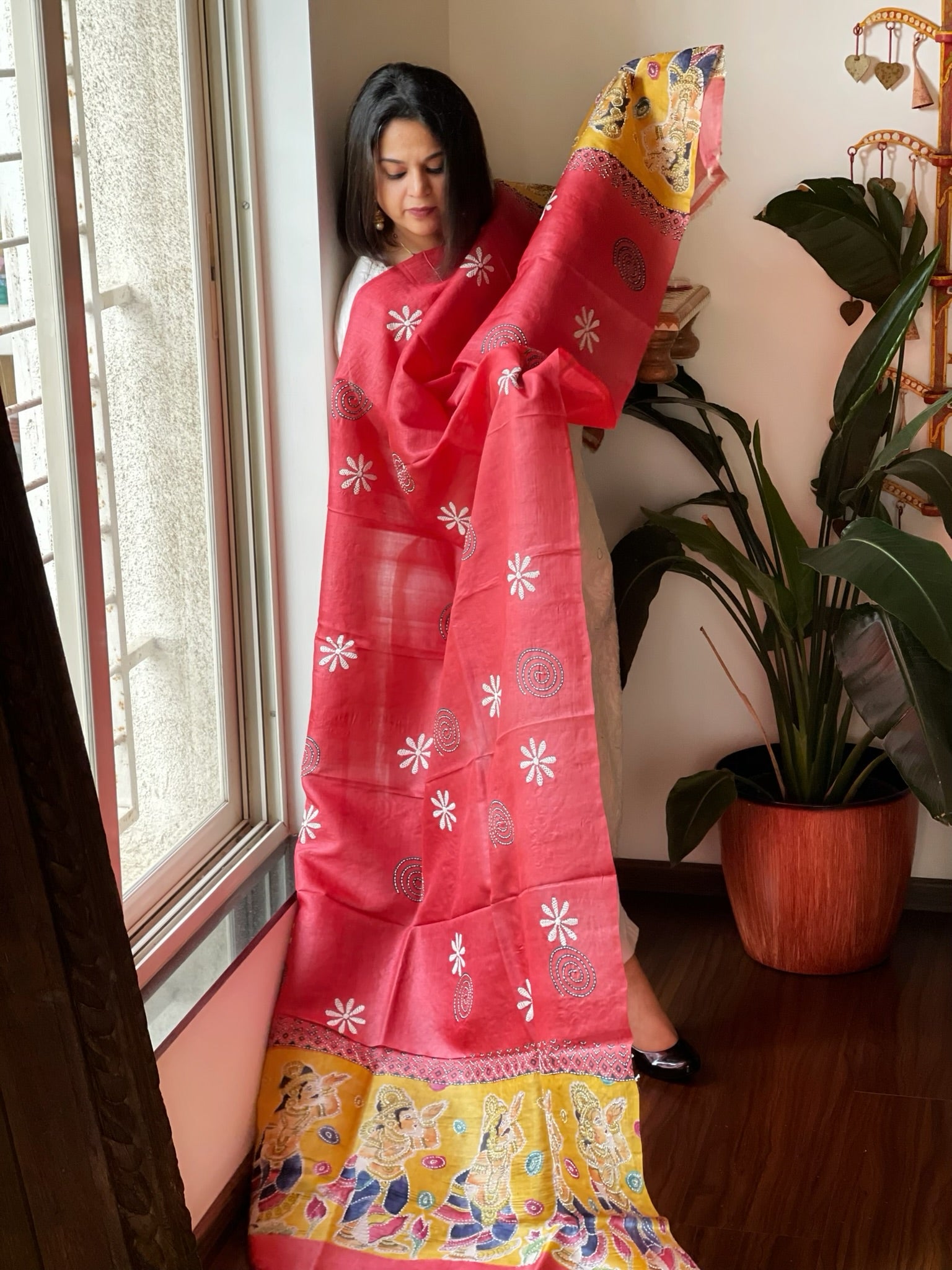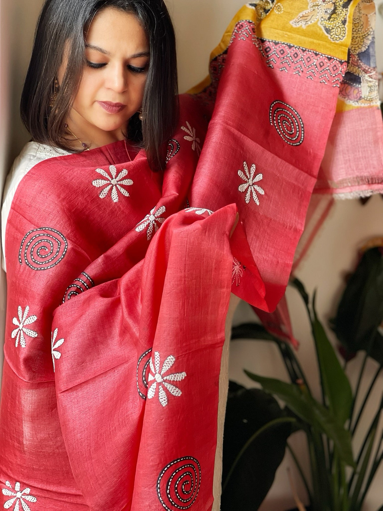 Red Handpainted Dupatta with Kantha Hand Embroidery in Pure Silk