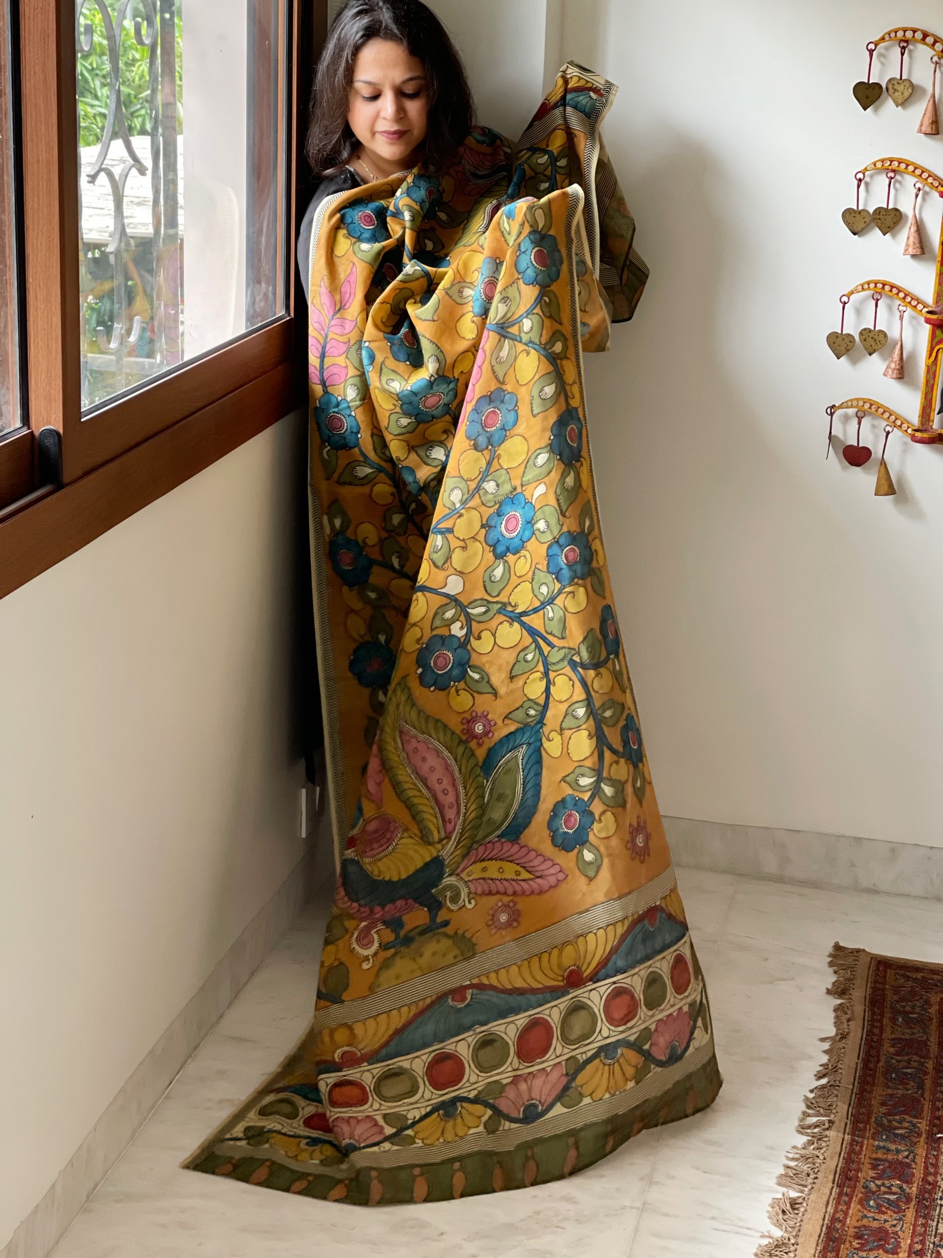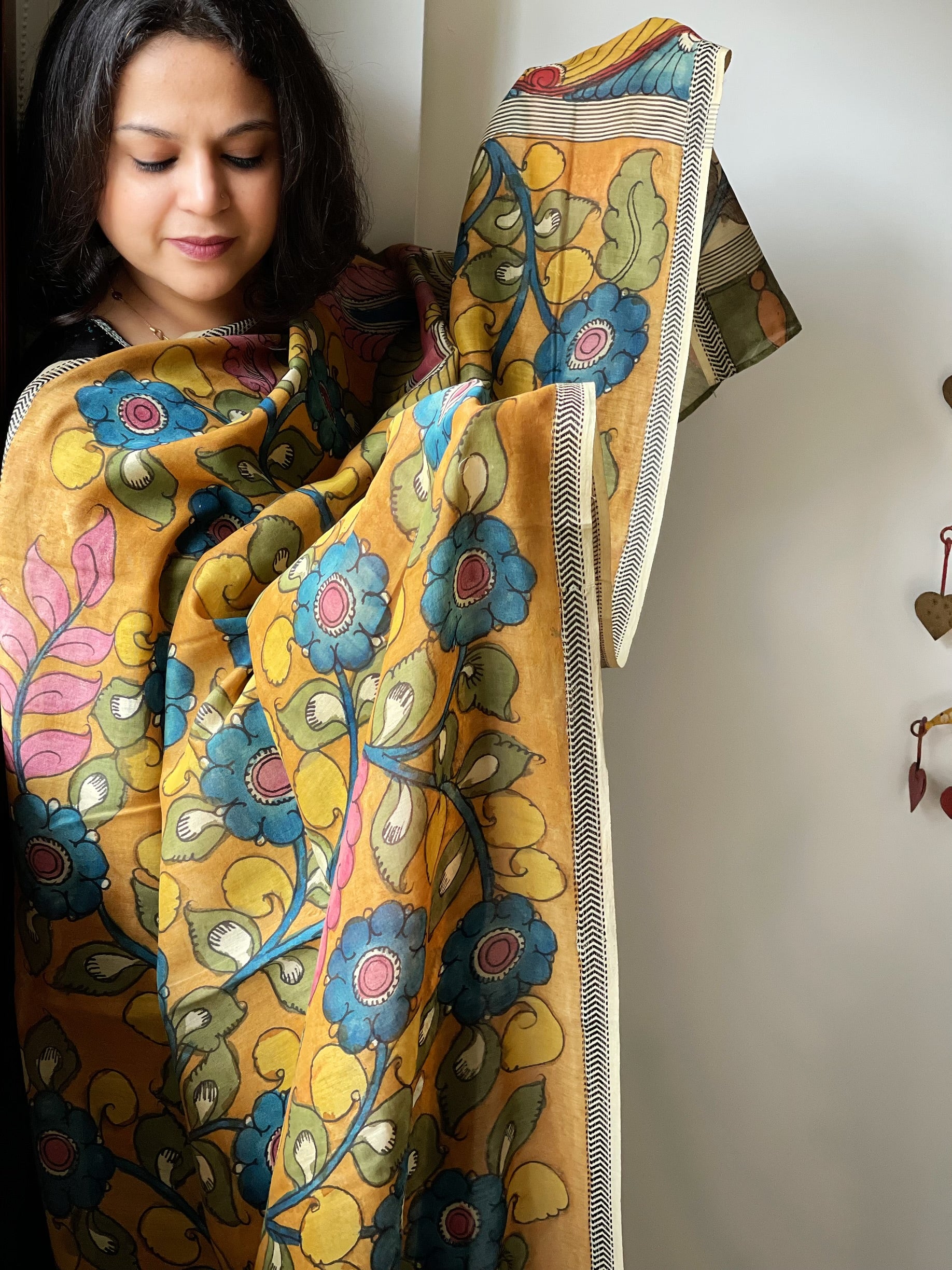 Experience the unique artistry of Sri Hastikala with our Handpainted Kalamkari Dupatta. Each piece is delicately crafted on pure Chanderi silk, showcasing the rich heritage and beauty of this ancient art form. Elevate your wardrobe with this one-of-a-kind piece.