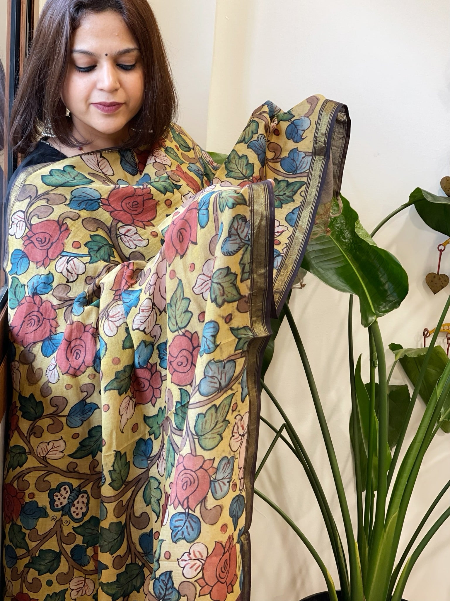 Experience the unique artistry of Sri Hastikala with our Handpainted Kalamkari Dupatta. Each piece is delicately crafted on pure Chanderi silk, showcasing the rich heritage and beauty of this ancient art form. Elevate your wardrobe with this one-of-a-kind piece.