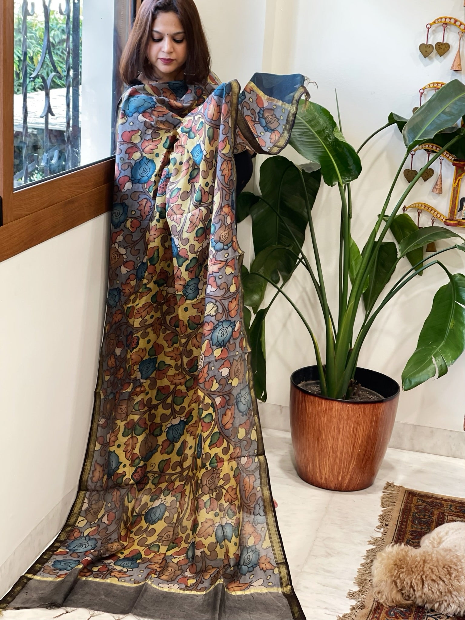 Experience the unique artistry of Sri Hastikala with our Handpainted Kalamkari Dupatta. Each piece is delicately crafted on pure Chanderi silk, showcasing the rich heritage and beauty of this ancient art form. Elevate your wardrobe with this one-of-a-kind piece.
