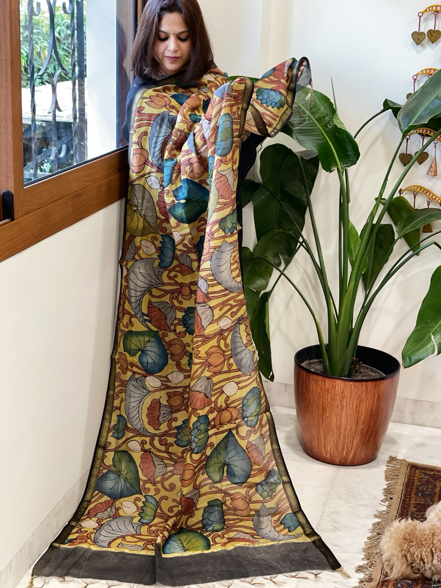 Experience the unique artistry of Sri Hastikala with our Handpainted Kalamkari Dupatta. Each piece is delicately crafted on pure Chanderi silk, showcasing the rich heritage and beauty of this ancient art form. Elevate your wardrobe with this one-of-a-kind piece.