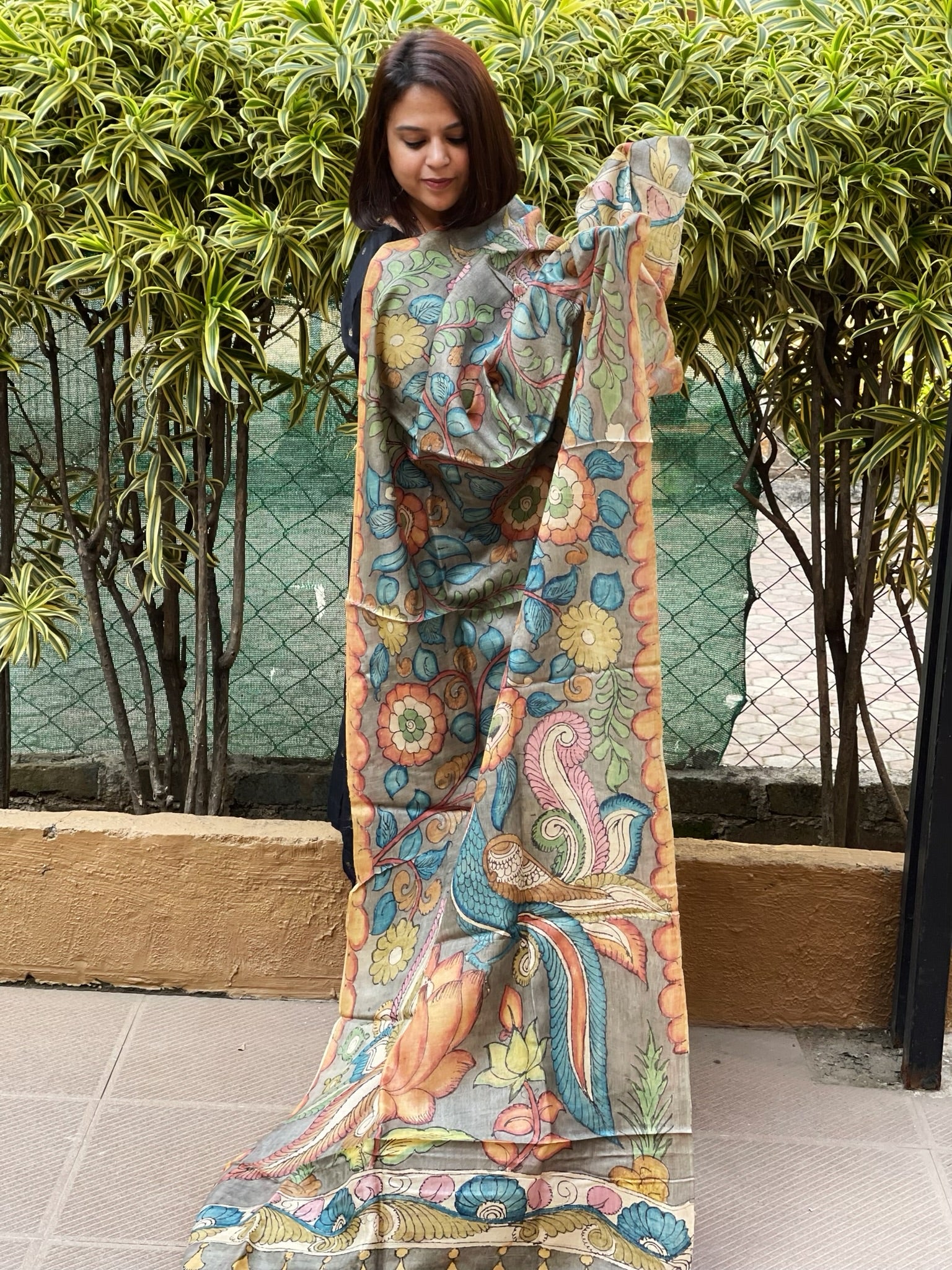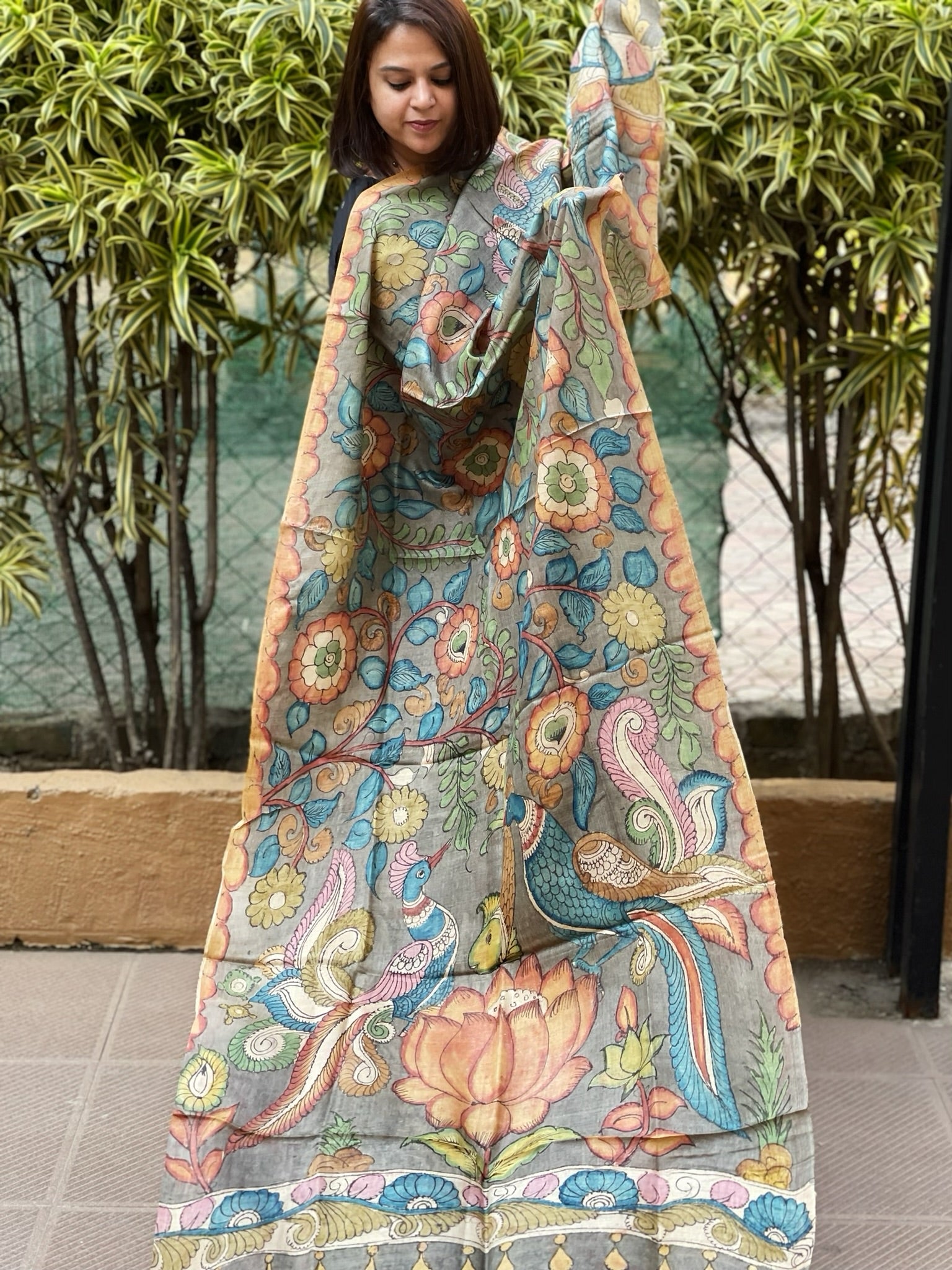 Experience the unique artistry of Sri Hastikala with our Handpainted Kalamkari Dupatta. Each piece is delicately crafted on pure Tussar silk, showcasing the rich heritage and beauty of this ancient art form. Elevate your wardrobe with this one-of-a-kind piece.