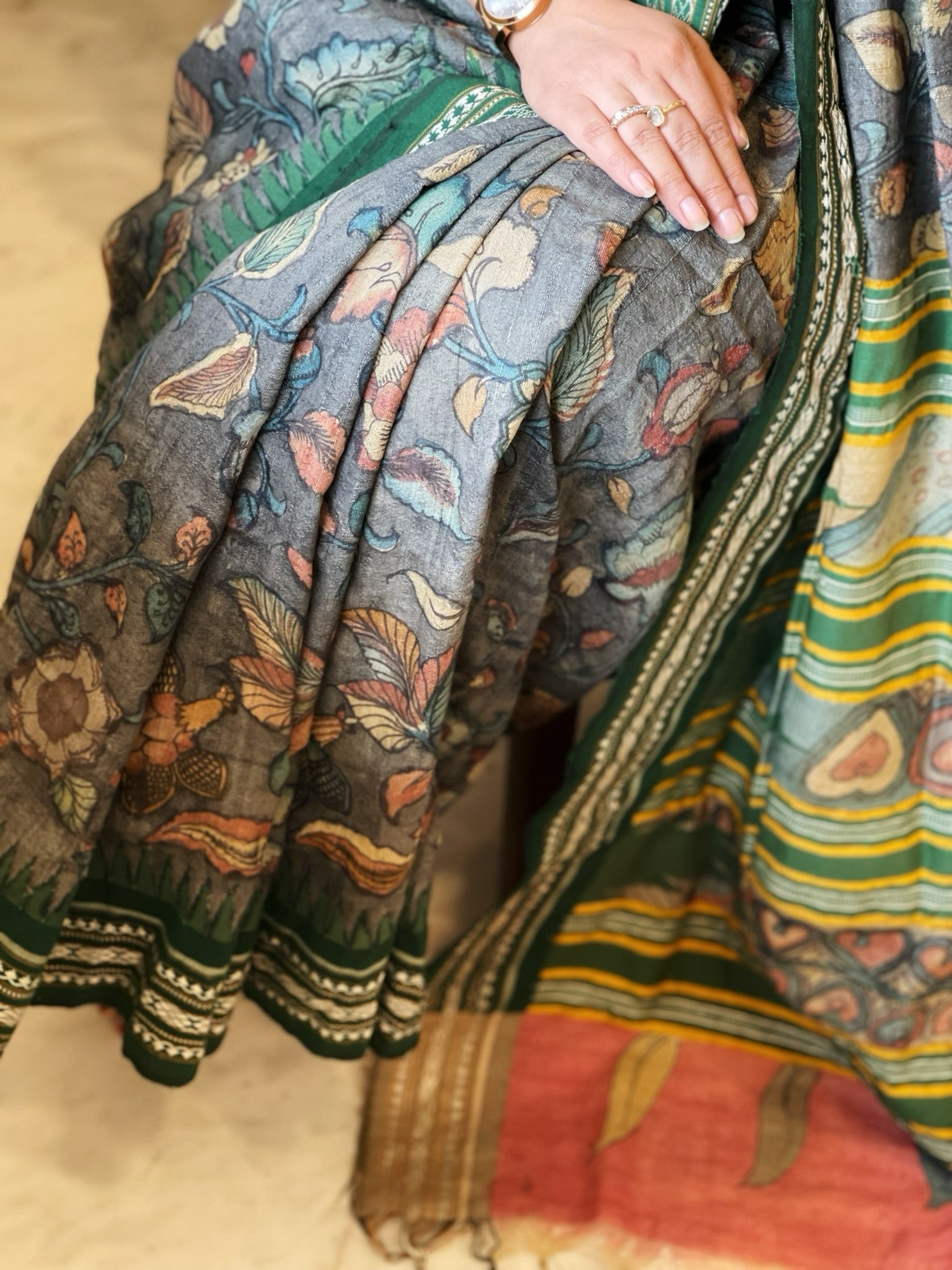 This exquisite saree combines the rich artistry of handpainted Kalamkari with the luxurious texture of pure tussar silk. Perfect for connoisseurs of fine fabrics and classical designs, this saree delivers sophisticated style for special occasions.