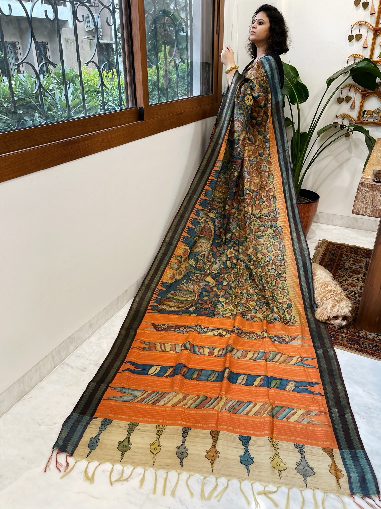 This exquisite saree combines the rich artistry of handpainted Kalamkari with the luxurious texture of pure tussar silk. Perfect for connoisseurs of fine fabrics and classical designs, this saree delivers sophisticated style for special occasions.