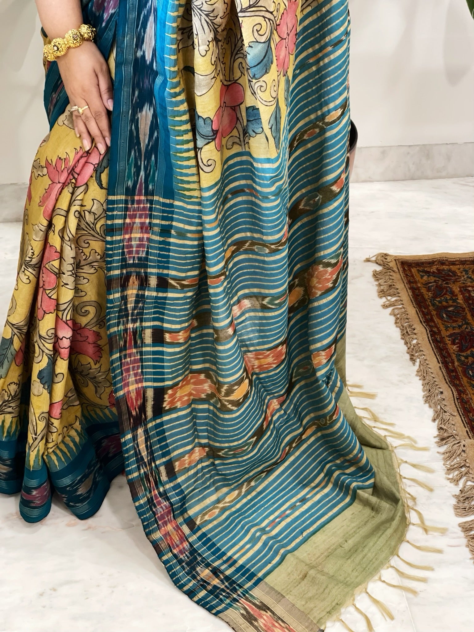 This exquisite saree combines the rich artistry of handpainted Kalamkari with the luxurious texture of pure tussar silk. Perfect for connoisseurs of fine fabrics and classical designs, this saree delivers sophisticated style for special occasions.