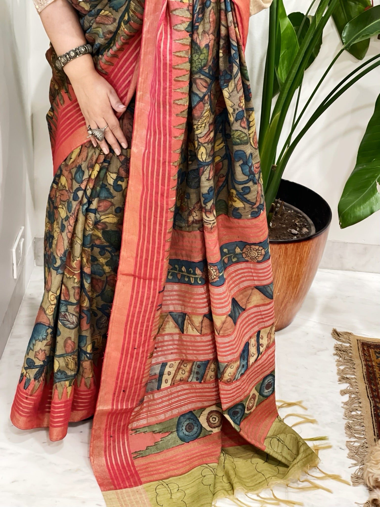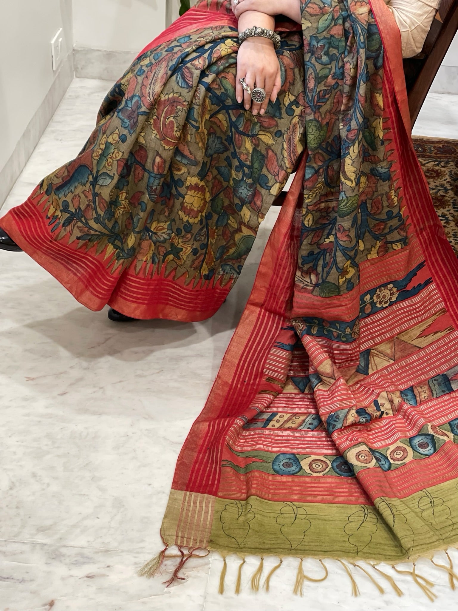 This exquisite saree combines the rich artistry of handpainted Kalamkari with the luxurious texture of pure vidharbha tussar silk. Perfect for connoisseurs of fine fabrics and classical designs, this saree delivers sophisticated style for special occasions.